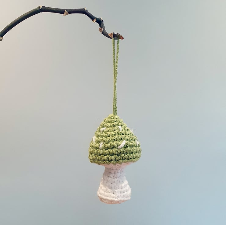 A cute little crochet toadstool bauble, made up in green cotton yarn. Perfect for any woodland or Scandi style decor this Christmas - or, simply because crochet mushrooms are adorable!