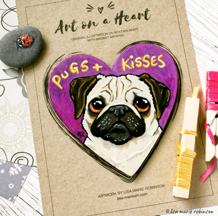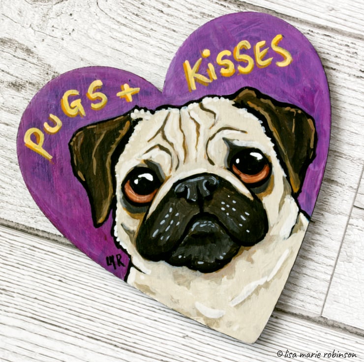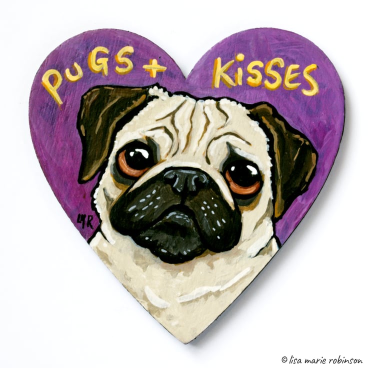 This super cute original illustration features an adorable brown-eyed pug and the words, Pugs and Kisses. Who wouldn't want kisses from this handsome chap?