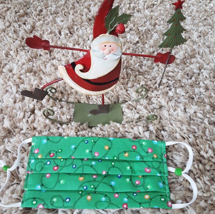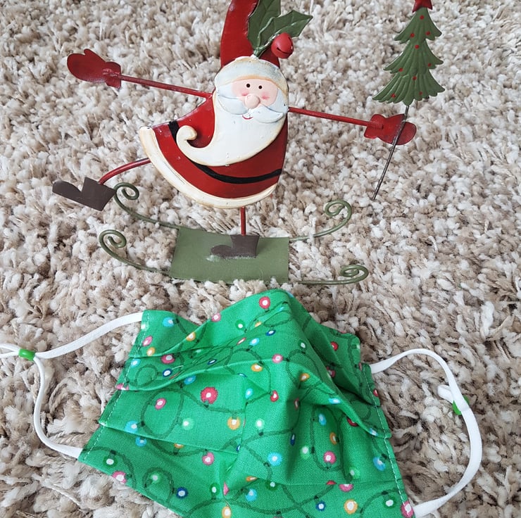 Adult festive face covering made from a green fairy lights print. The face mask is made with 2 layers of cotton forming an inner pocket for a filter (not included) and is fastened over the ears with 2 loops of elastic and a toggle adjuster.