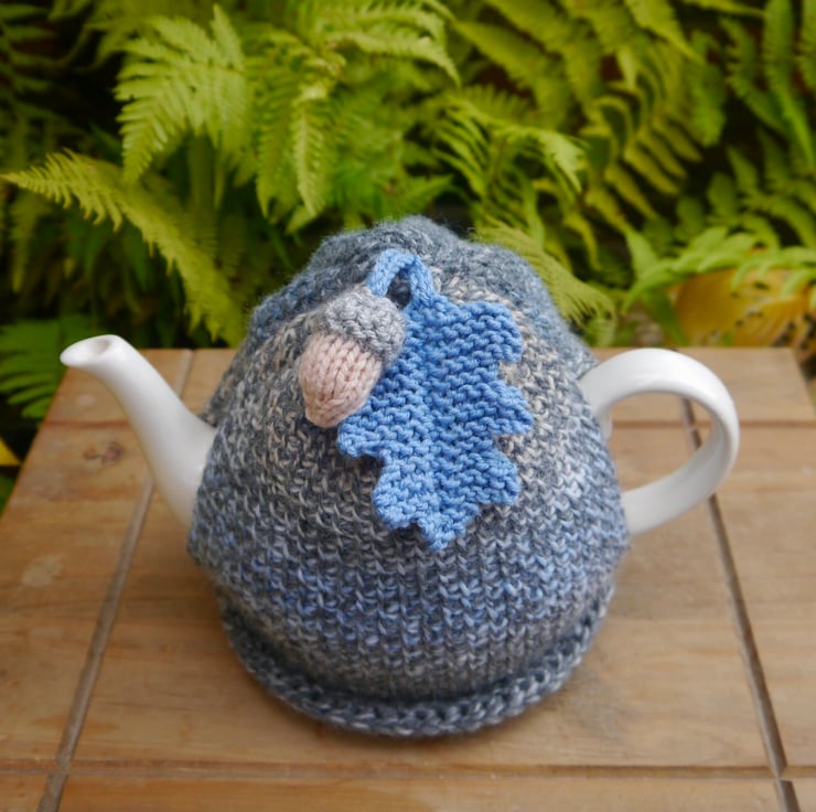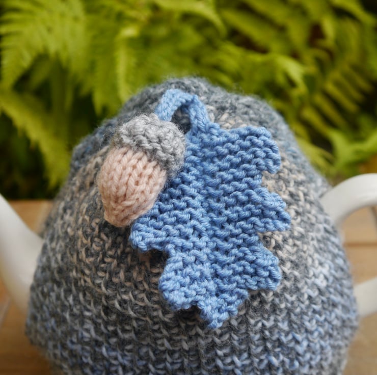 The teacosy is made with a lovely soft marbled acrylic yarn in shades of blue and grey. The hand knitted acorn and oak leaf are made with a mixture of acrylic and wool yarns in complementary shades of blue, grey and peach.