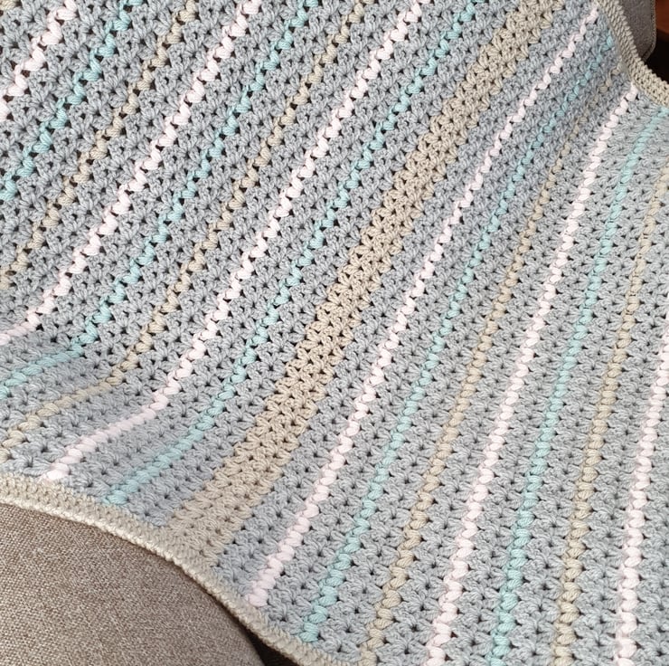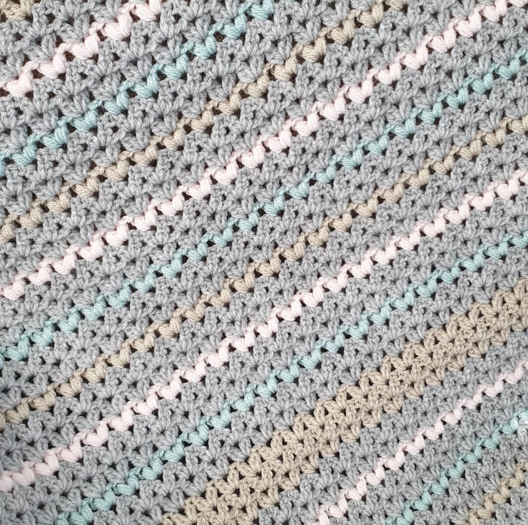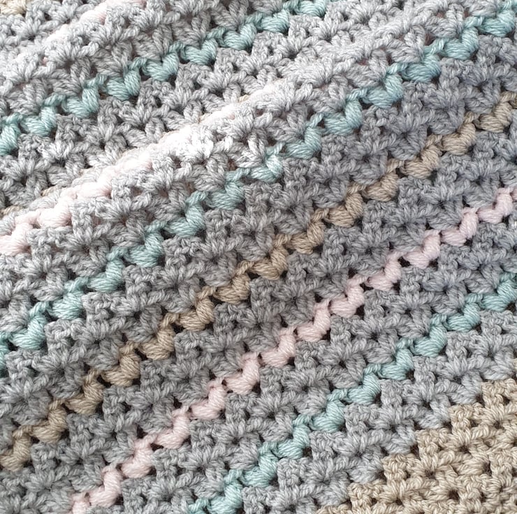 Neutral colours with delicate stripes of pink and teal. Effective modern stitch. Ideal as a lap, cot, pram blanket.