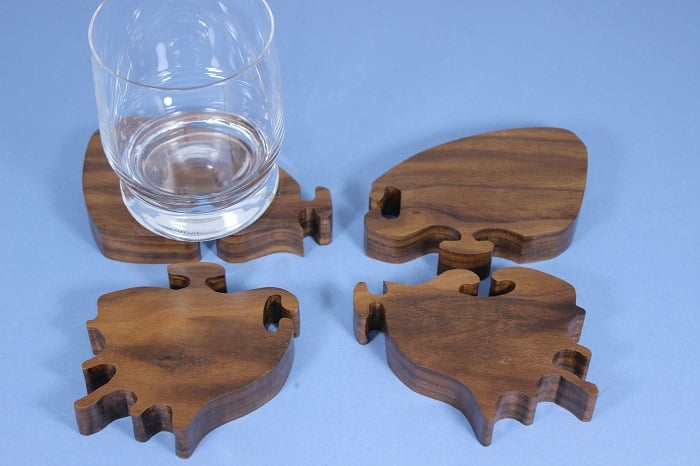 Making coasters required little ingenuity, the thought process was more about creating something different from just a pile of mats. My initial square jigsaw design allowed the coasters to be stored in a simple and decorative way and can also be used as a base for ornaments or plants. The design progressing to this ornamental butterfly which looks fantastic as a side ornament.