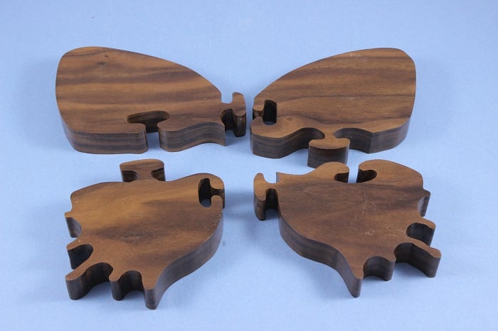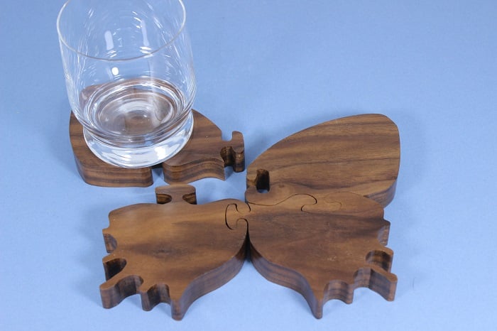 A chunky set of four jigsaw coasters made from a piece of walnut which is particularly hard and dense giving a beautiful finish. The overal dimensions of the butterfly being 150mm x 21mm thick. The Coasters have been finished with multiple coates of drying oil giving a durable, deep satin finish.