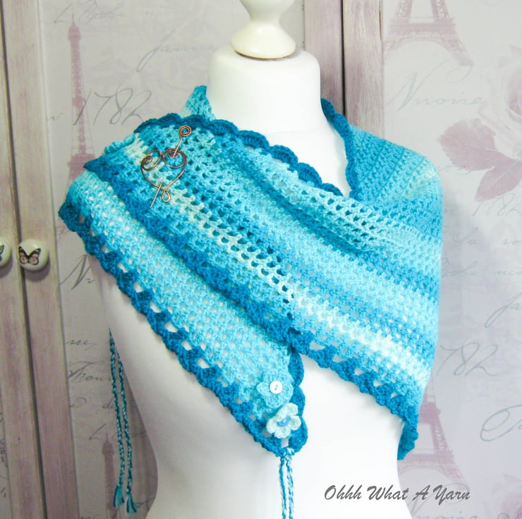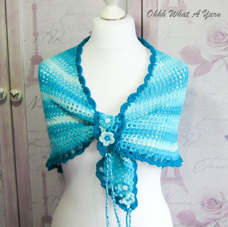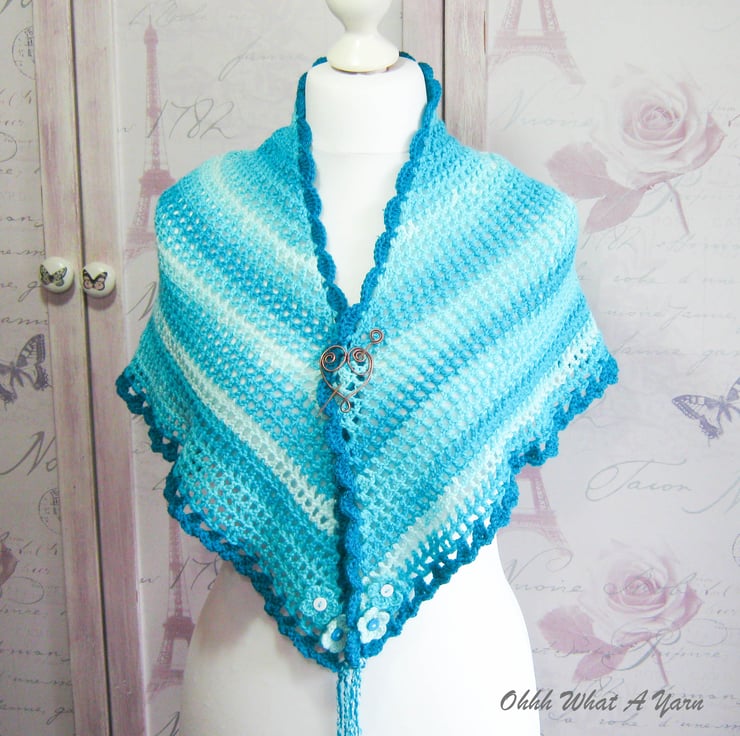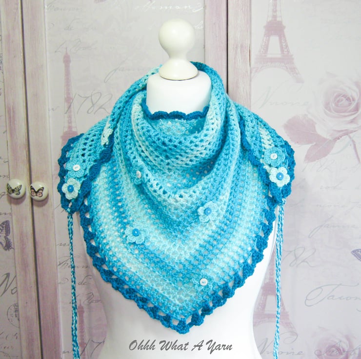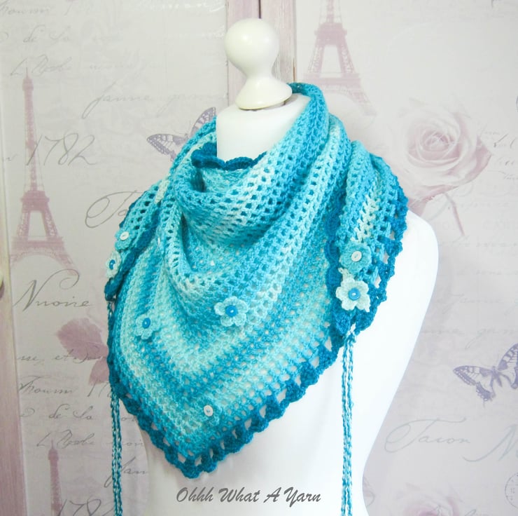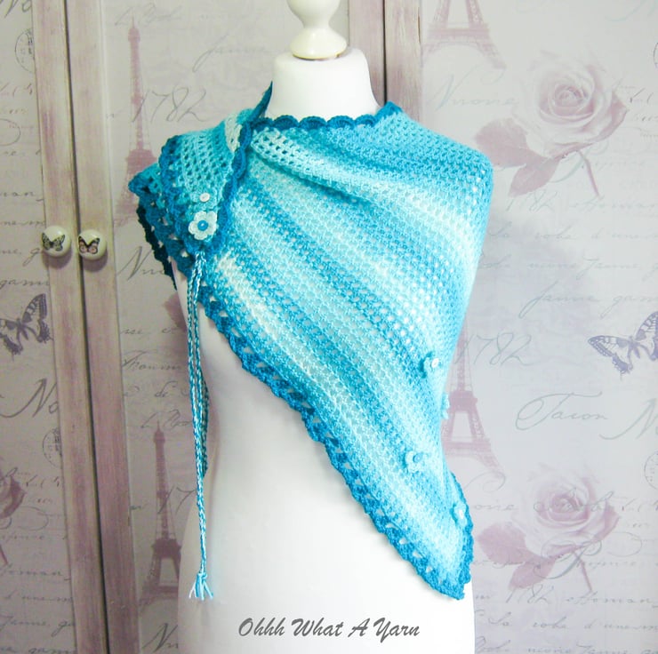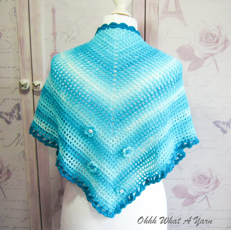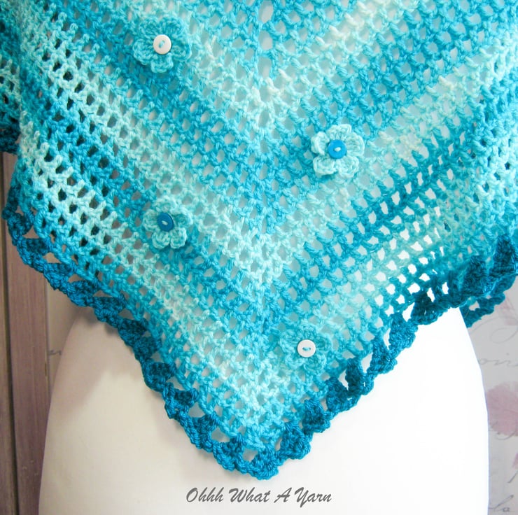 This beautiful triangle boho style shawlette/scarf is crocheted in premium 100% acrylic colour changing yarn in shades of turquoise and it has a lovely mesh pattern. It has applique flower decorations with button centres.