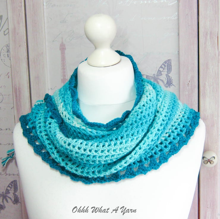 The scarf can be worn in a variety of styles, see photos. The scarf is finished off with handmade twisted cords which can be removed if preferred.
