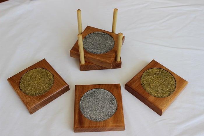 A set of four 'glitter' coasters, two silver & two gold. The coasters are set in a sycamore wood frame finished with multiple coates of drying oil, producing a durable, deep satin sheen. The solid wood frames are infilled with clear resin over a glitter background. The coasters come complete with sycamore stand. Each coaster measures 94mm x 94mm x 20mm thick.
