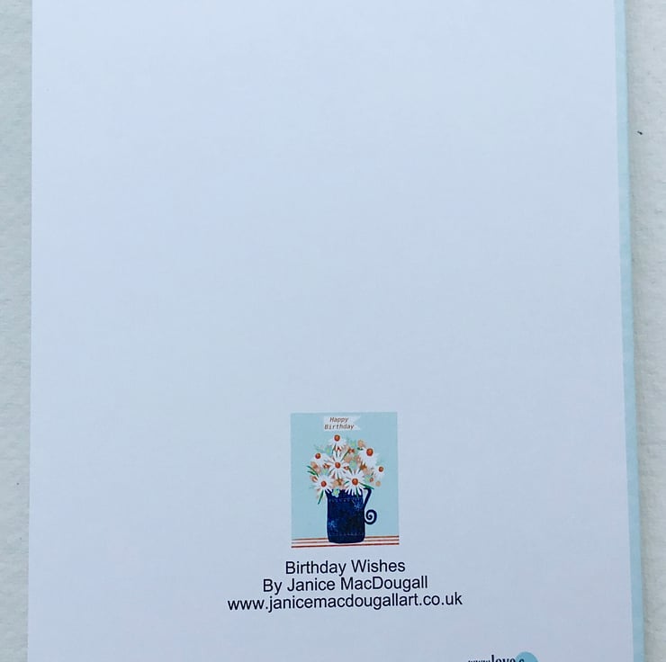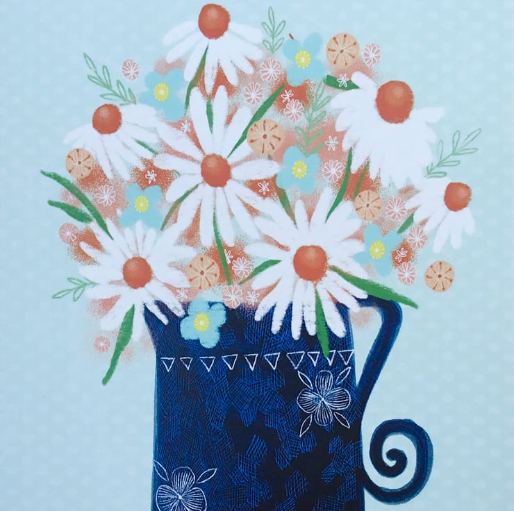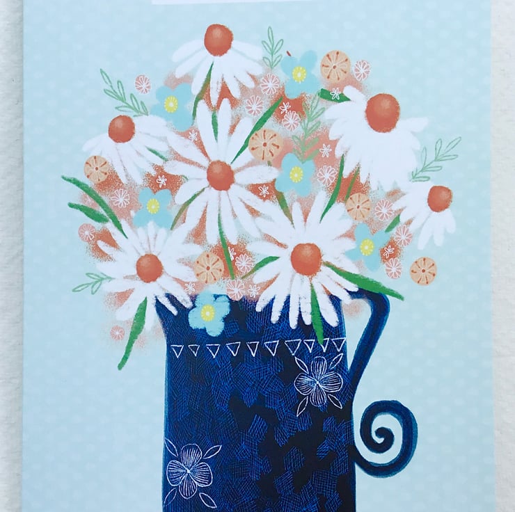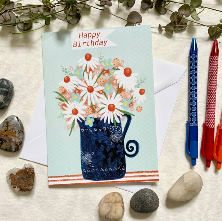 A pretty floral birthday card featuring some daisies in a blue patterned jug. This card measures 12.5x17.5cm and is blank inside. It comes with an envelope.