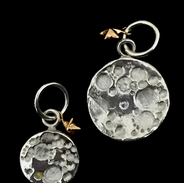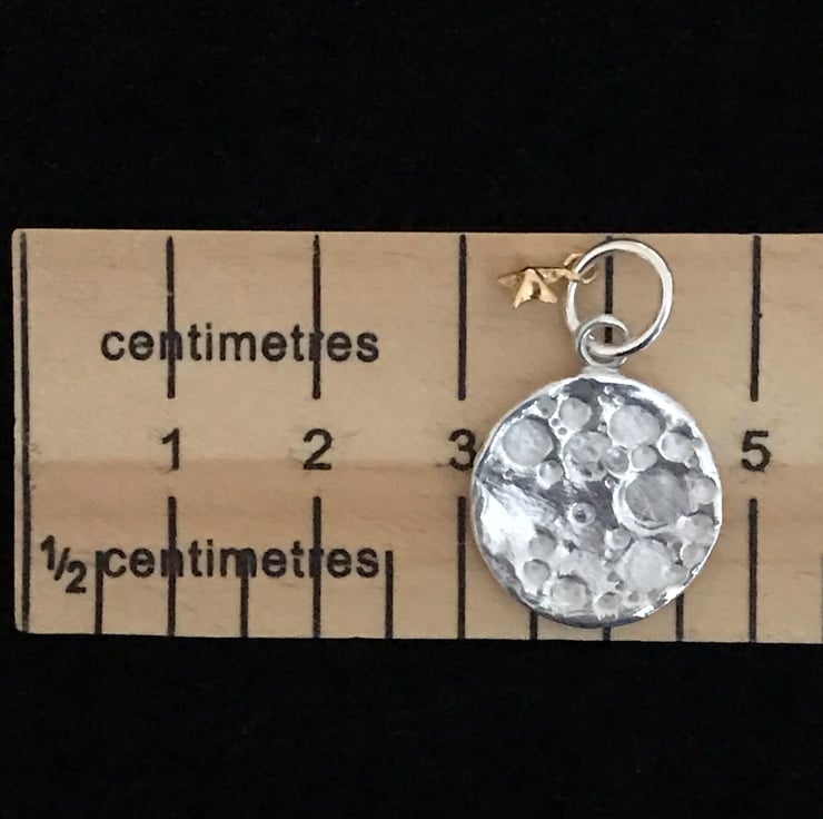 A beautiful full moon pendant. Hand rolled from silver clay then impressed with craters and surface detail. A shiny surface and matte craters add to the 3D effect. As each one is made to order and unique, there may be slight differences of pattern. Your moon will come on a 16/18inch sterling silver chain with a mini gold plated silver charm.