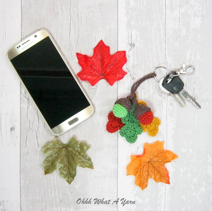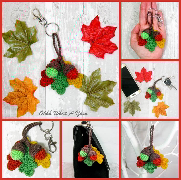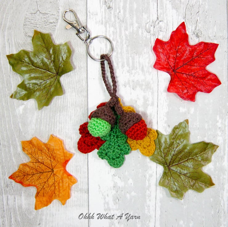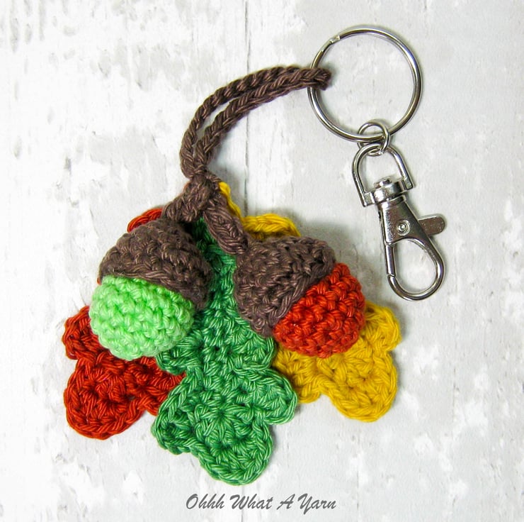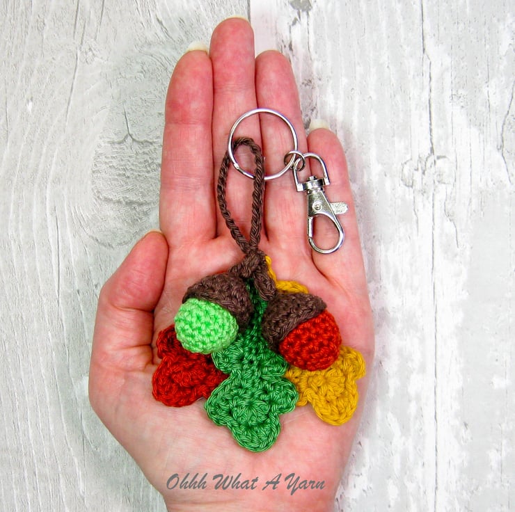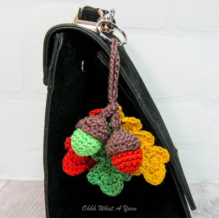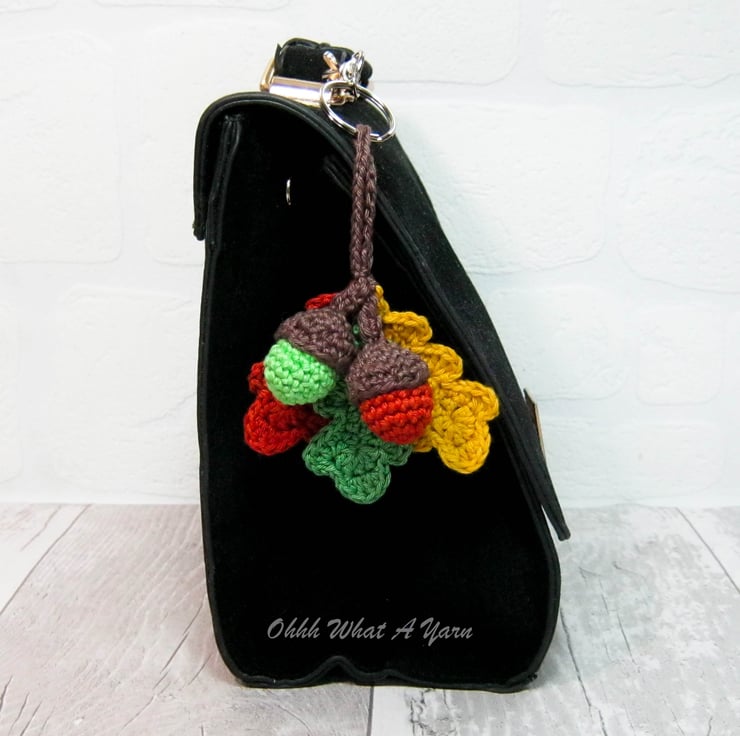 These autumnal acorn and oak leaves bag charms have been crocheted with mercerised cotton yarns giving them a lovely sheen and stitch definition.