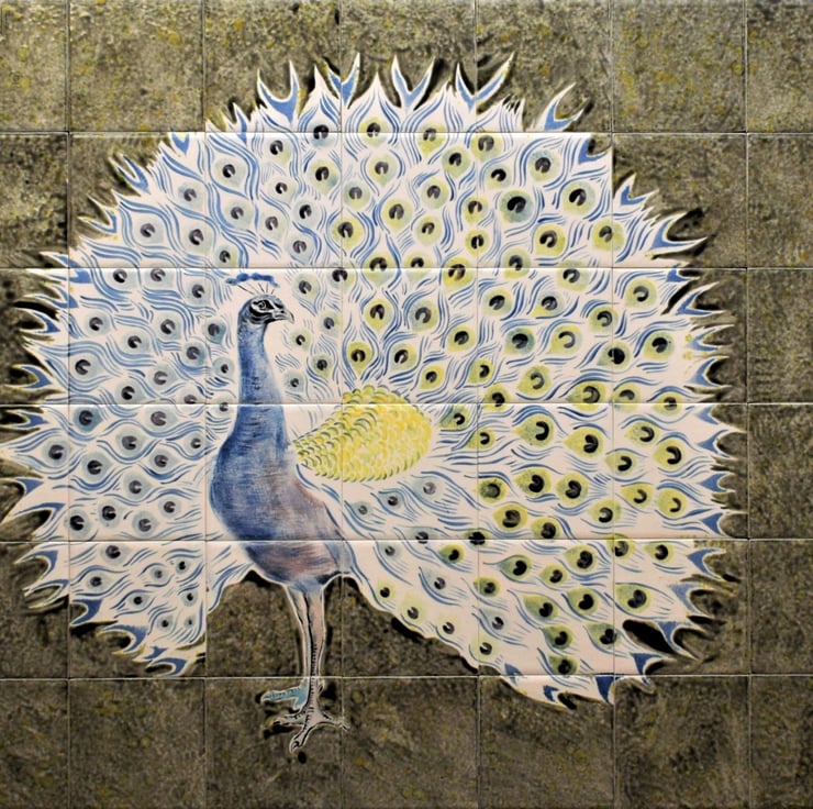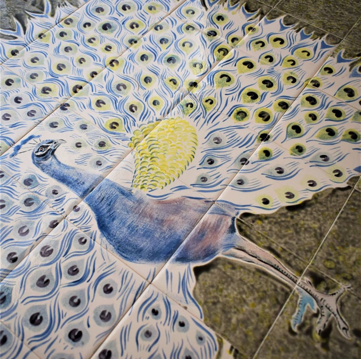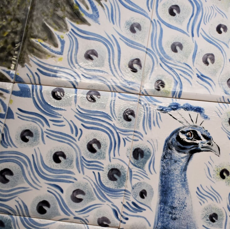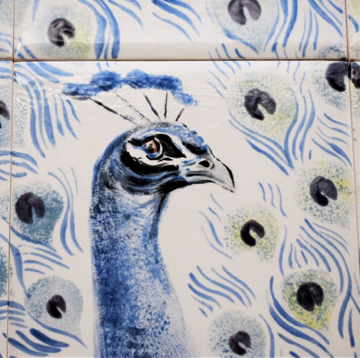 Hand-painted Tiles with a magnificent peacock on a grey background.