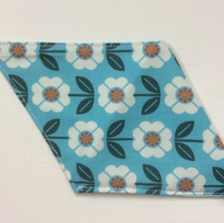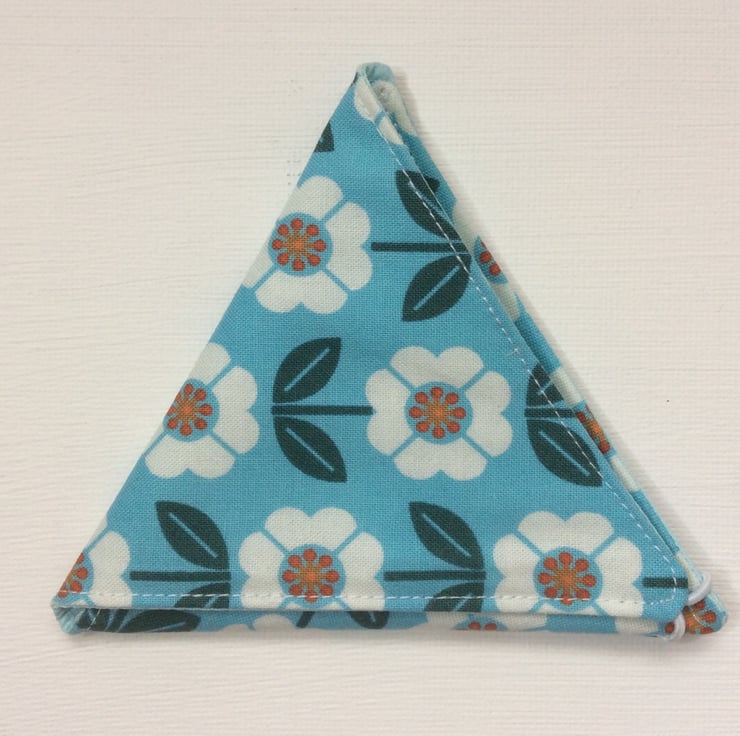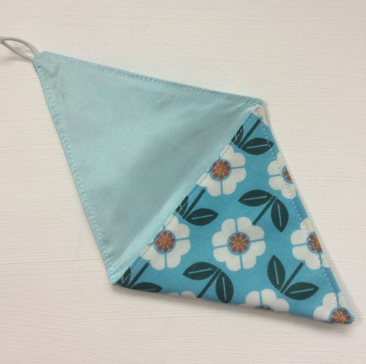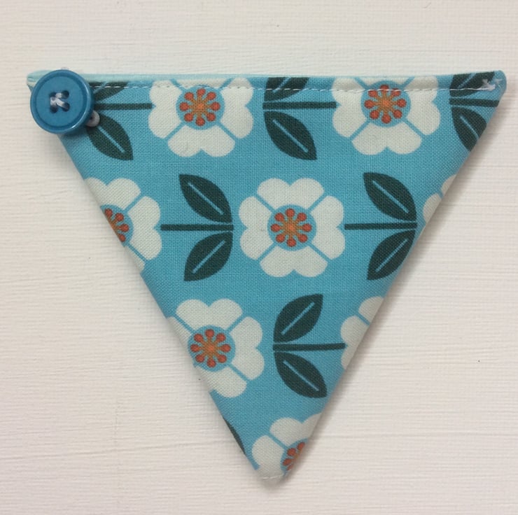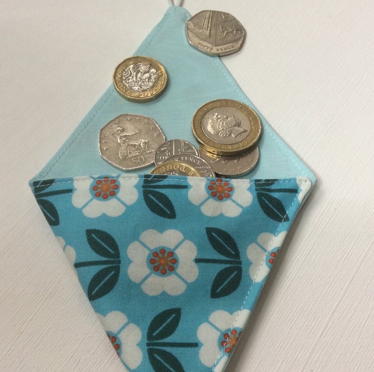 This small coin purse is perfect for change for the car park or other small items that need to be kept safe. The purse is made using a turquoise cotton fabric with white flowers and dark green leaves. The lining is a matching turquoise satin The purse is approximately 10cm x 10cm x 10cm. It has a white elastic loop and turquoise button closure.
