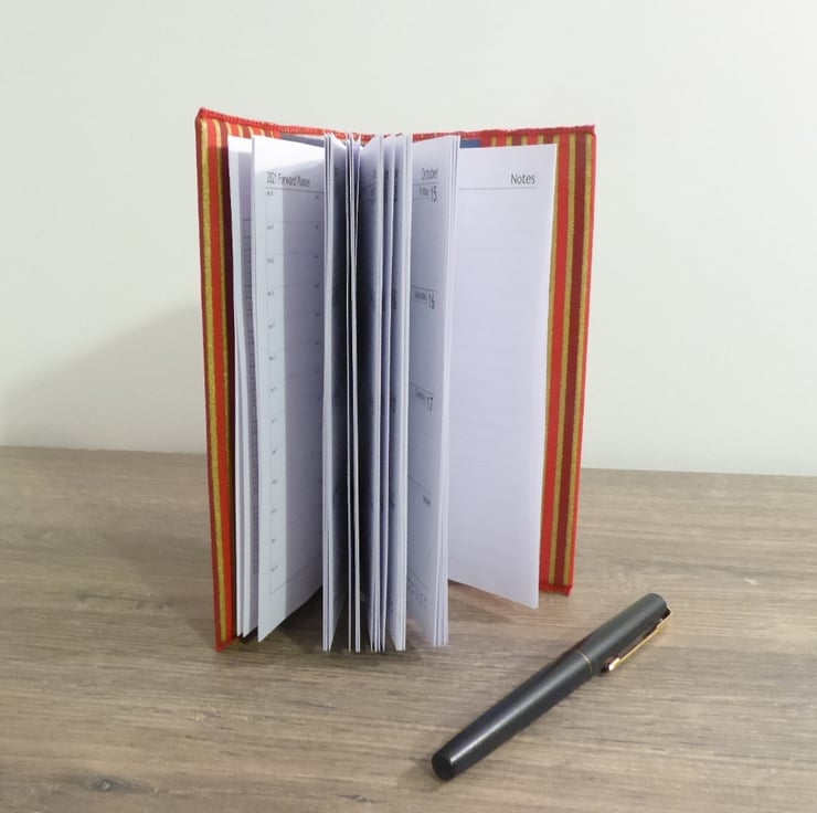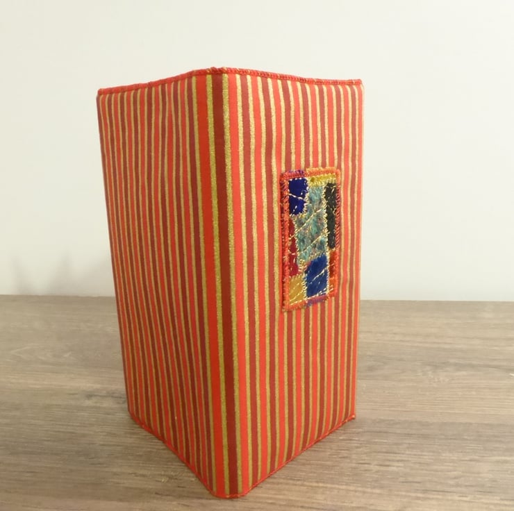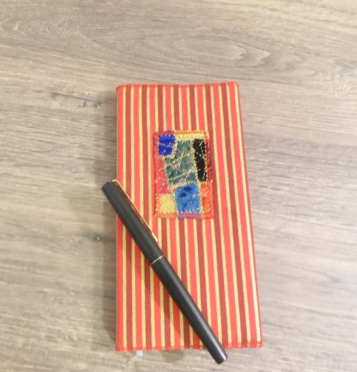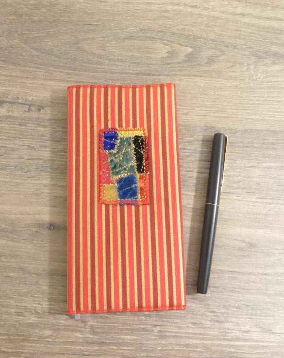 "A very smart 'week to view' slim line diary (80 x 162 cm) with a slip cover in red and gold striped fabric and small free machined velvet patchwork collage panel on the front. It has been lined with Vilene and edged with red stitching. The cover is removable so can be reused year after year on a standard slim line diary.