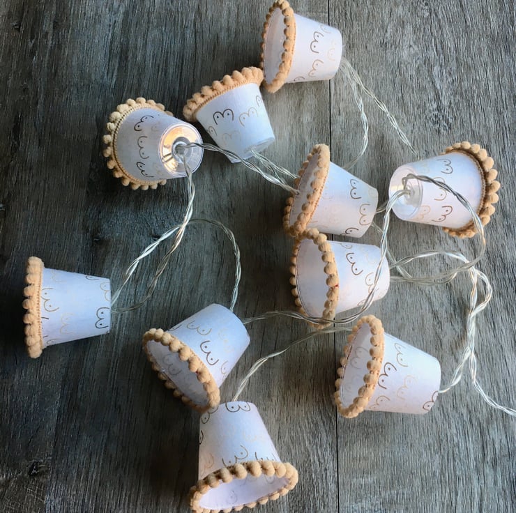 There are ten mini lampshades in each set on a battery-operated string of warm white fairy lights with timer function. The length overall length is 1.8 metres, and the length from first mini lampshade to last is 1.2 metres.