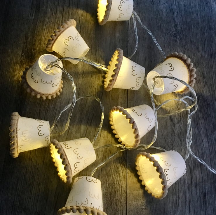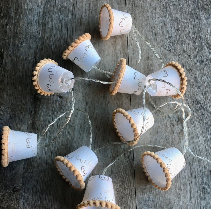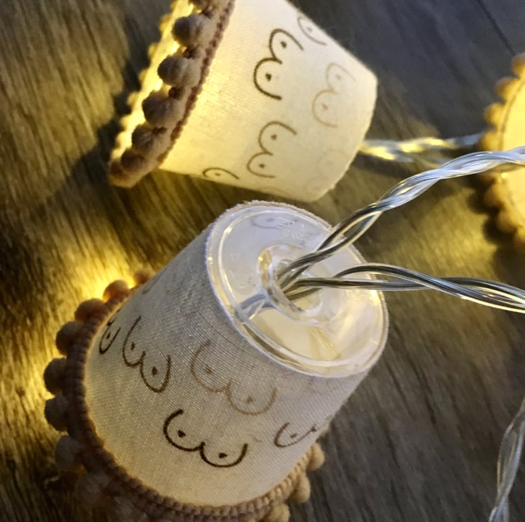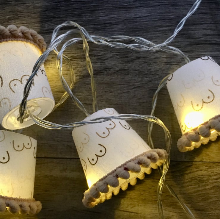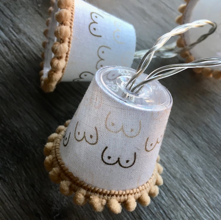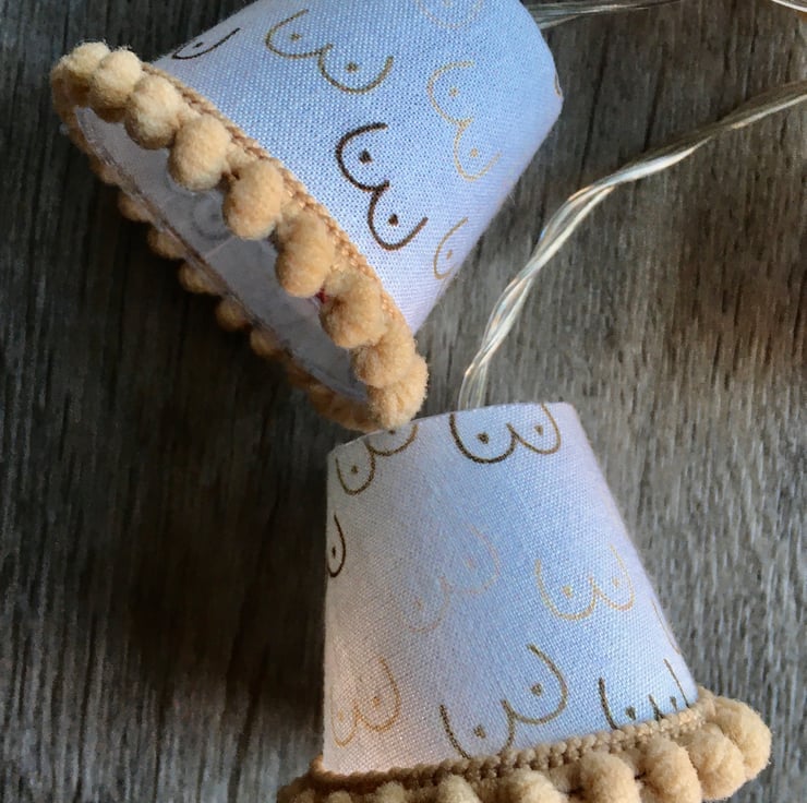 These lampshades are covered in a fun fabric covered in mini boobies.