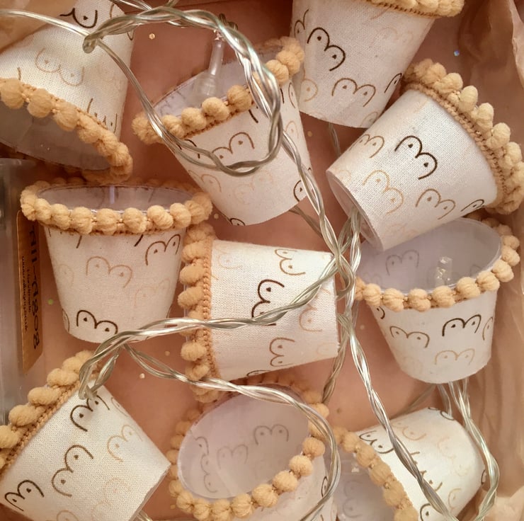 These mini lampshades are perfect to drape along a mantlepiece or shelf, around the head of a bed, or strung across a mirror or picture frame.