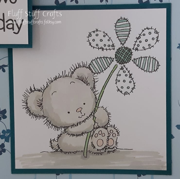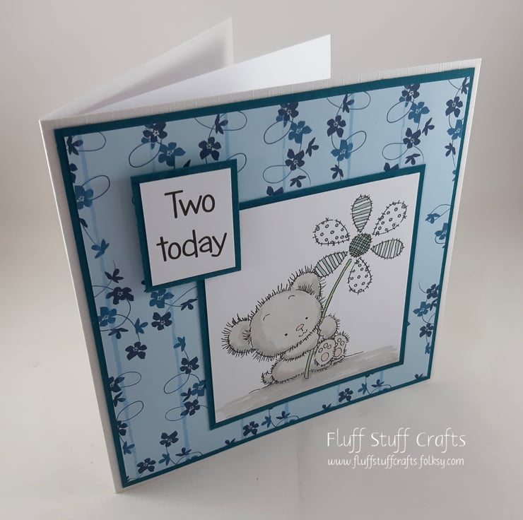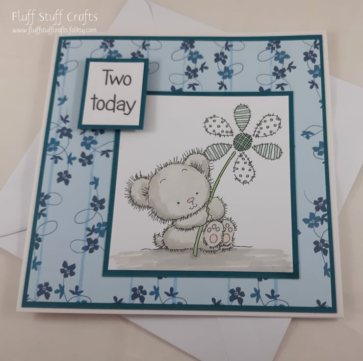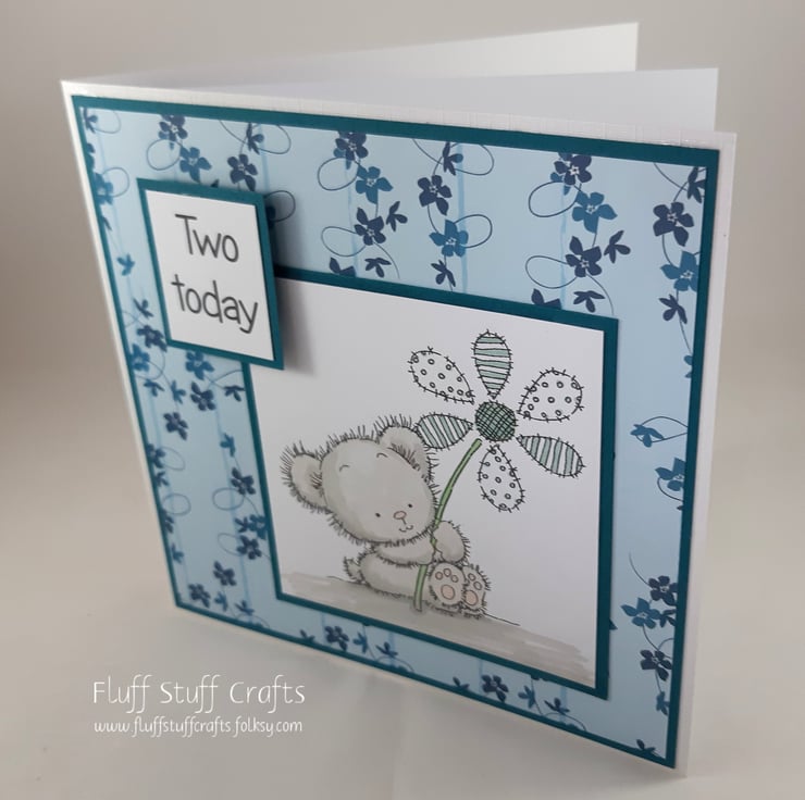 Square 2nd birthday card, featuring a cute bear holding a patchwork flower in shades of blue/teal. The image and sentiment 'Two today' have been overlaid onto teal coloured card, over a coordinating patterned background.