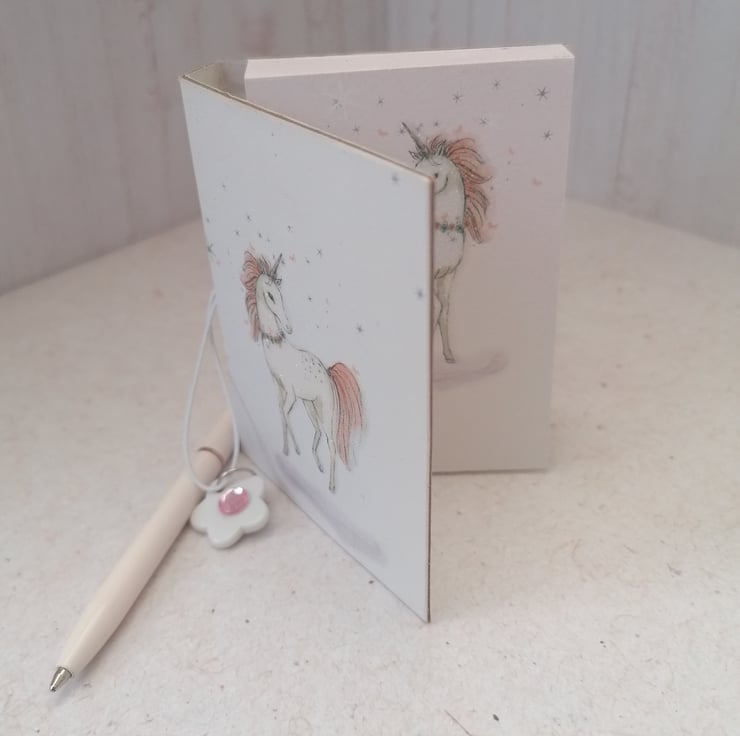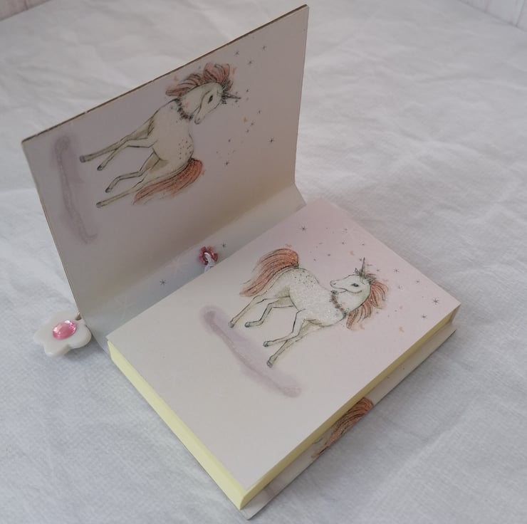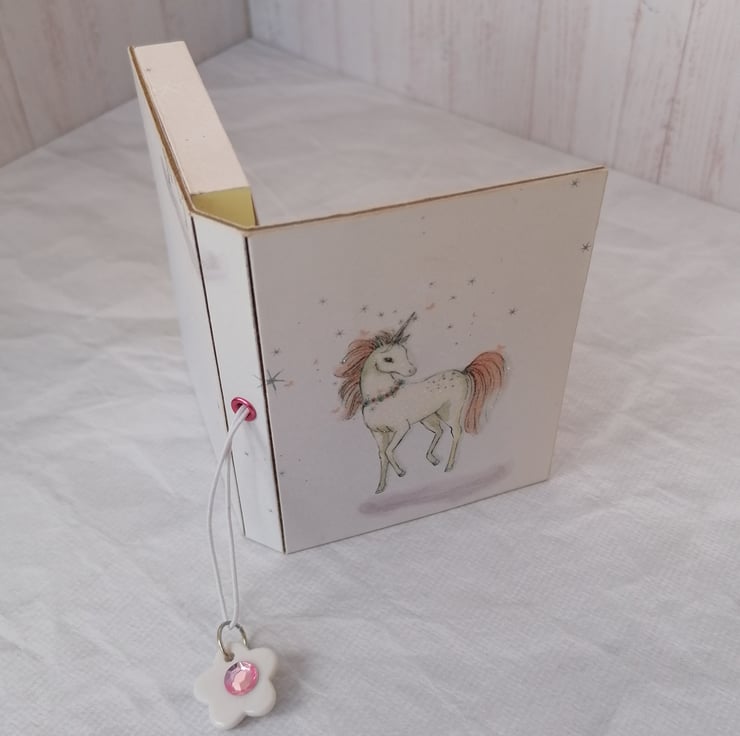 The cover is made from upcycled packaging covered in a decorative unicorn glittered paper. It is held closed with an elastic fastening embellished with a small flower charm.