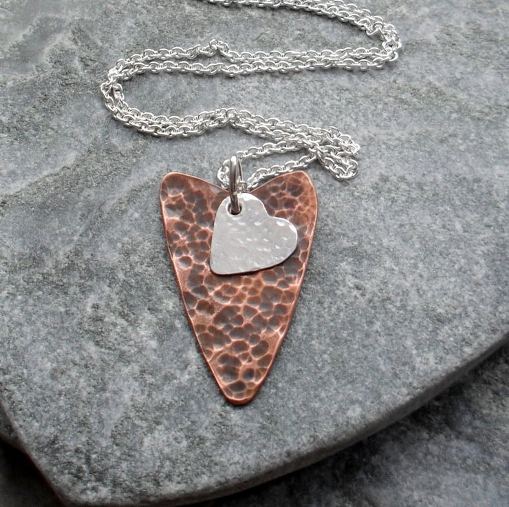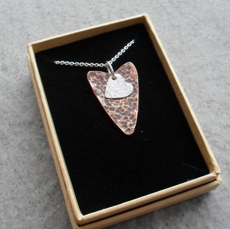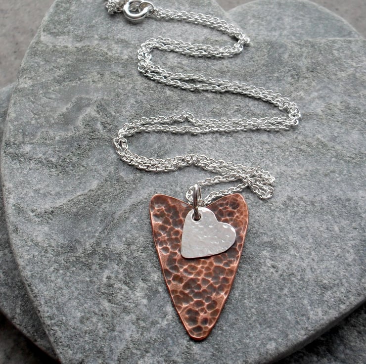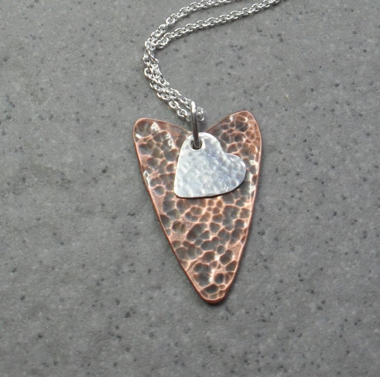 Copper heart pendant which has been cut from a sheet of copper then the pendant has been sanded and hammered to give texture. The copper heart has a small sterling silver heart attached with the silver ring