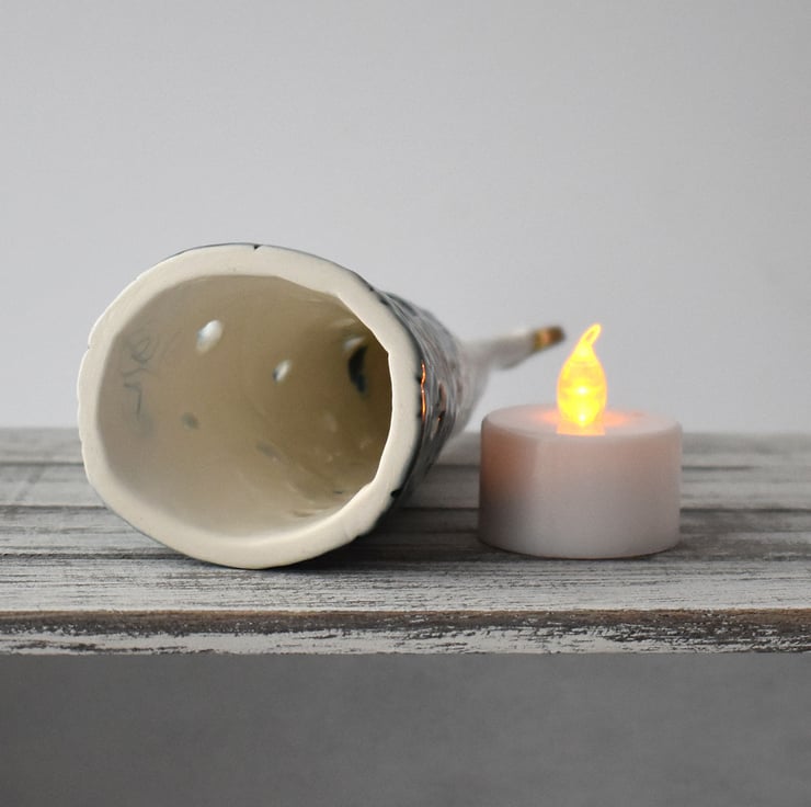 TAKE CARE: This ornament is supplied with a battery powered LED tealight (except for international orders). If you wish to use it with a wax tealight, please stand it on a non-flammable surface and take care when lifting the cover as it will be heated by the flame.