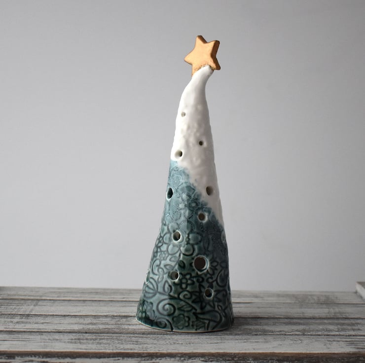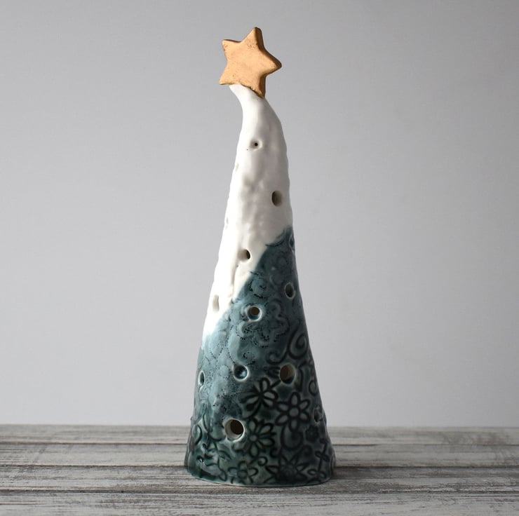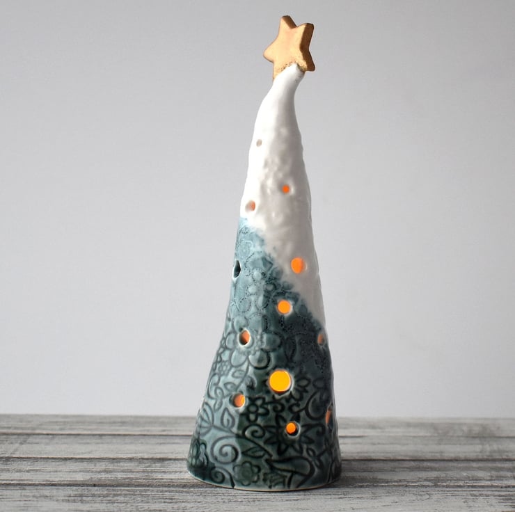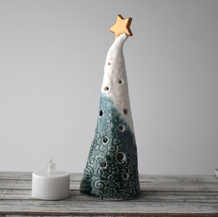 A cone shaped pottery Christmas tree with LED tea light included, standing around 17.5cm tall.
