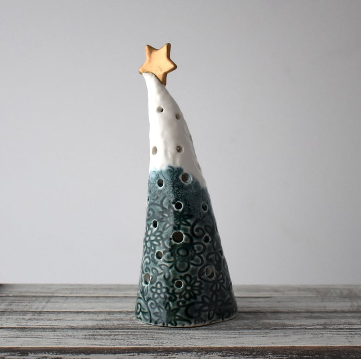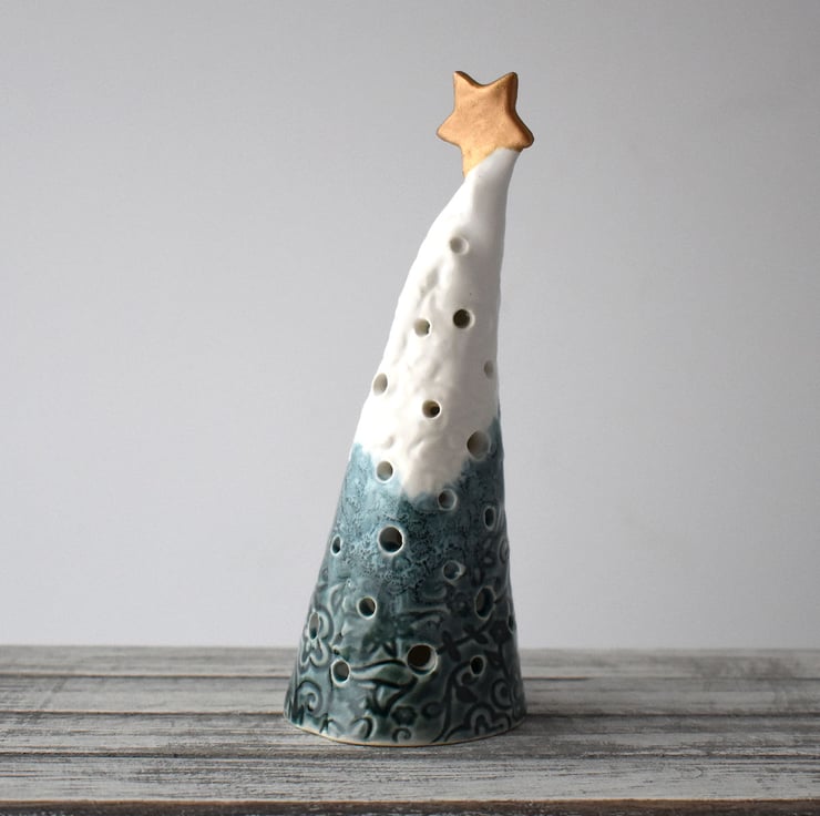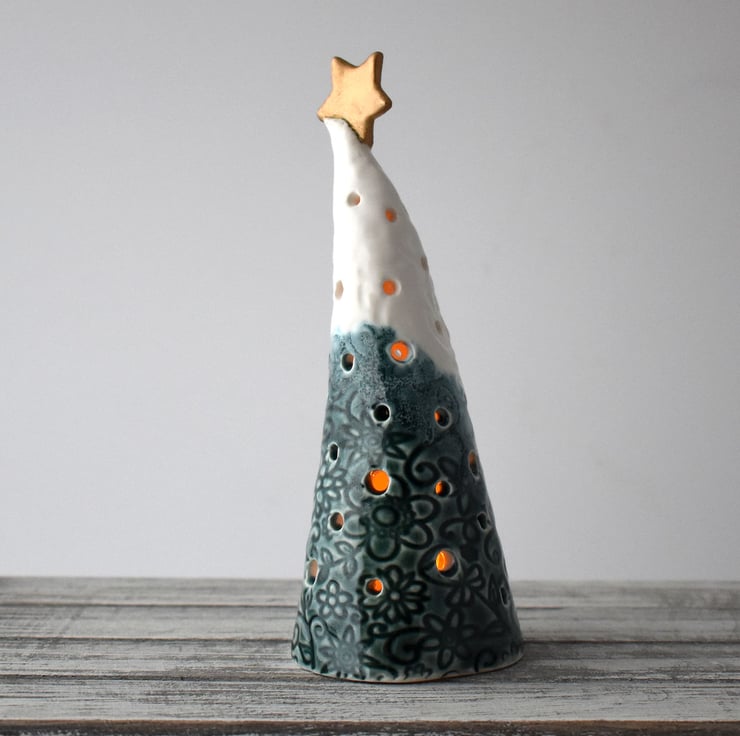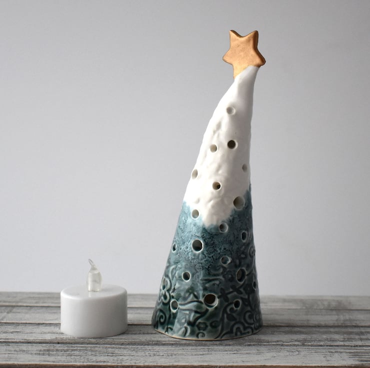 A cone shaped pottery Christmas tree with LED tea light included, standing around 16.5cm tall.