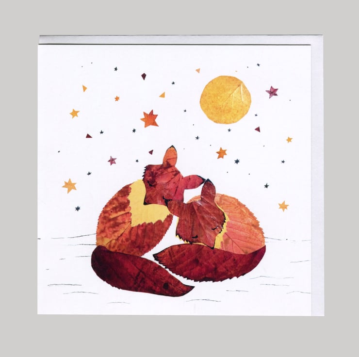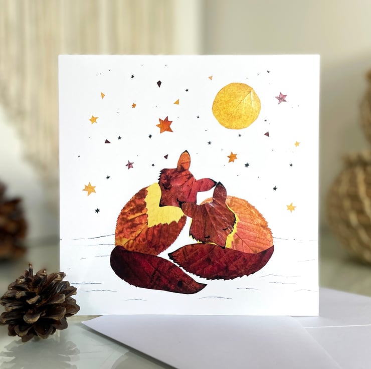 Sleeping Foxes, Pressed Autumn Leaf Print card,