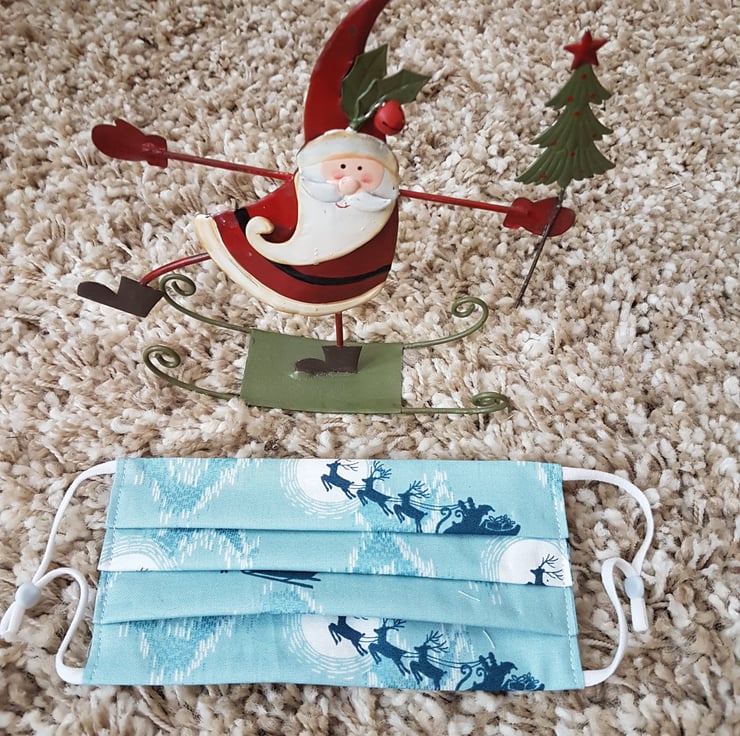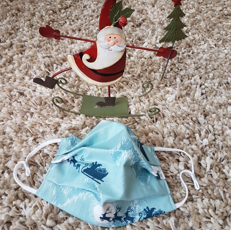 Adult festive face covering made from a flying santa and reindeers print on teal sparkly cotton. The face mask is made with 2 layers of cotton forming an inner pocket for a filter (not included) and is fastened over the ears with 2 loops of elastic and a toggle adjuster.