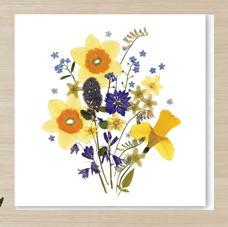 This lovely bright pressed flower print card 'Spring Bouquet' originally was created with real pressed flowers collected by myself in the wild, garden or bought some. I did this floral spring bouquet with daffodils/ narcissus, bluebells, forget me nots, Cynthia Postan/Californian lilac and other wildflowers. This card is wonderful to give to your loved ones! Suitable for any occasion!