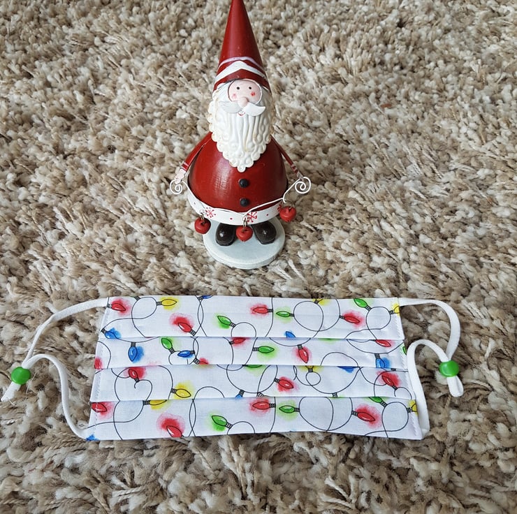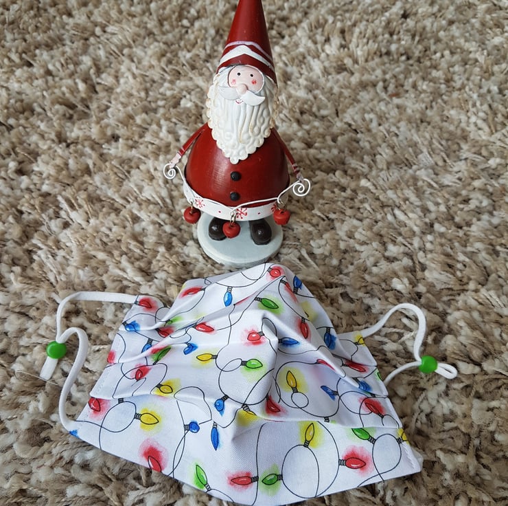 Small Adult/Teenager festive face covering made from a twinkly lights print. The face mask is made with 2 layers of cotton forming an inner pocket for a filter (not included) and is fastened over the ears with 2 loops of elastic and a toggle adjuster.