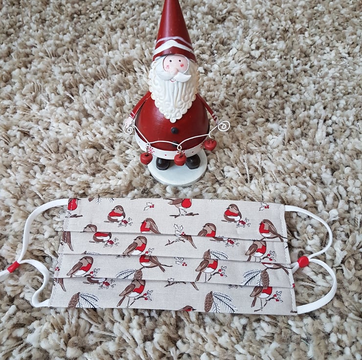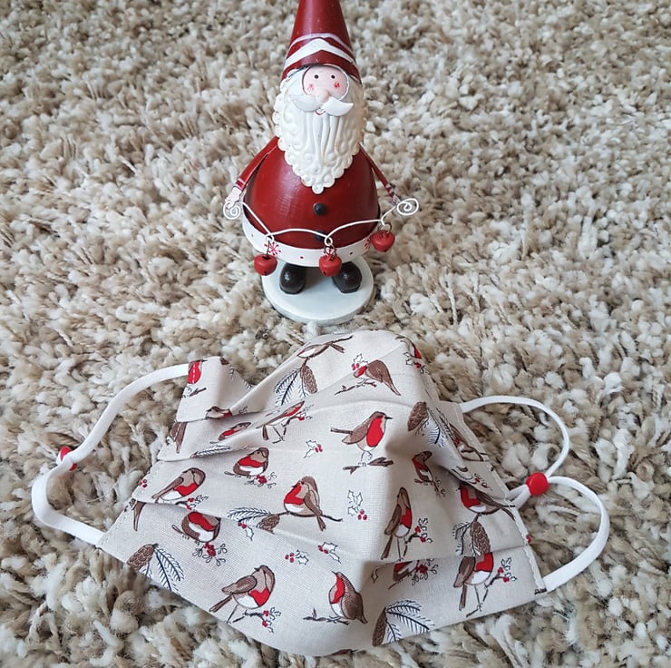Small Adult/Teenager festive face covering made from a robins on branches print. The face mask is made with 2 layers of cotton forming an inner pocket for a filter (not included) and is fastened over the ears with 2 loops of elastic and a toggle adjuster.