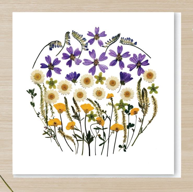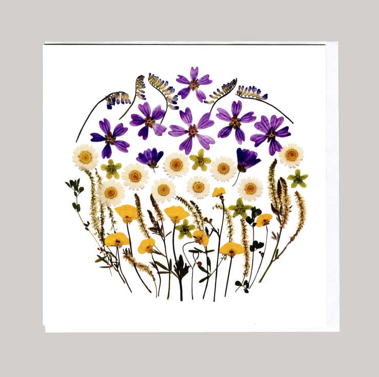 This beautiful pressed flower print card 'Flower Circle II' originally was created with real pressed flowers collected by myself in the wild, garden and some bought. I did this floral circle for enjoyment finding right flowers and composition from it! Never glued, just took a photo and decided to make into beautiful print cards.