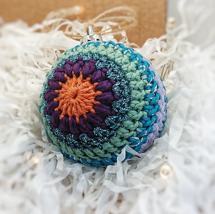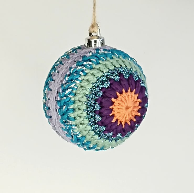 They have been crocheted using cotton yarn with glitter yarn around a plastic bauble, with a twine hanging loop.