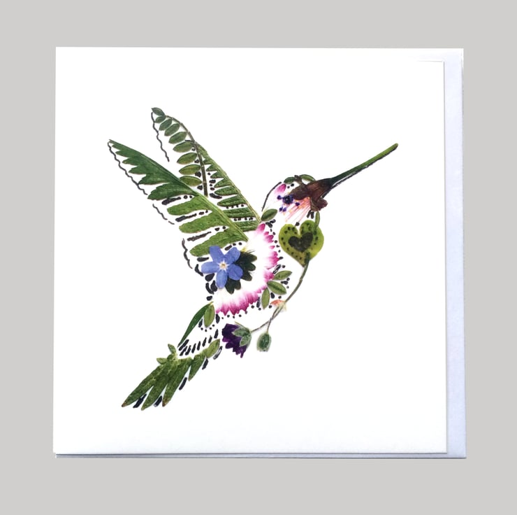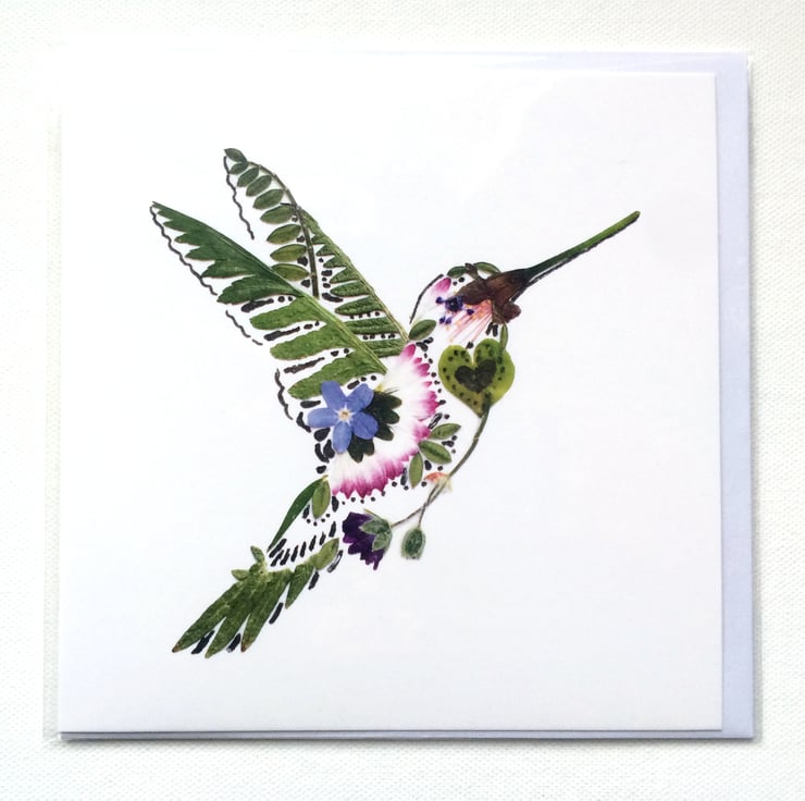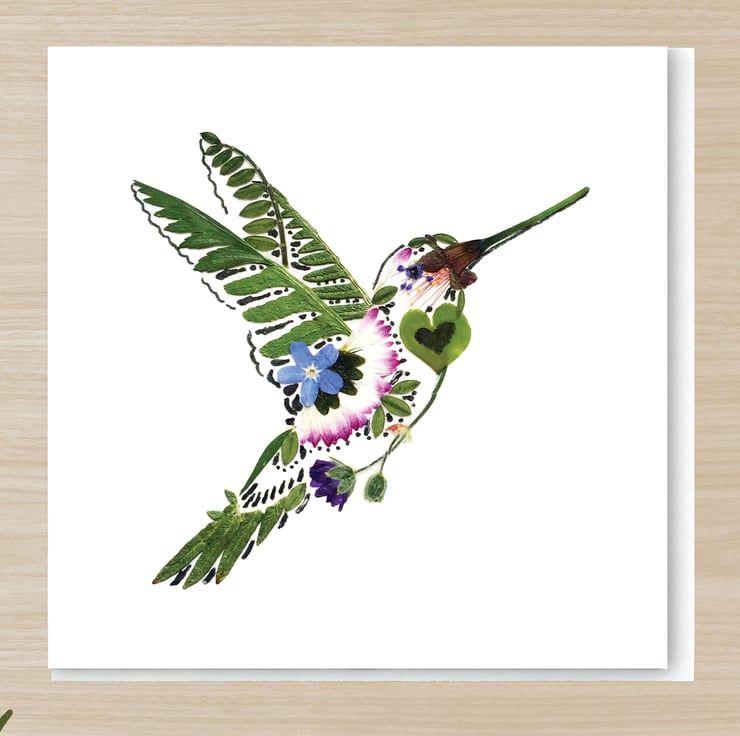 This beautiful pressed flower print card 'Hummingbird' originally was made out of the pressed flowers and leaves, that I picked myself in a summer time. It is a wonderful card for any occasion and particurlaly who is fascinated by tiny birds like hummingbirds!