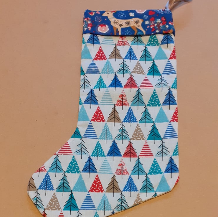 Cute cotton fabric stocking, featuring Christmas Trees on the outside and snowflakes on the lining and trimmed with blue fabric featuring deer.