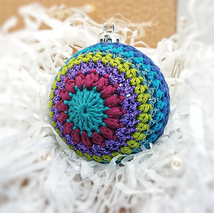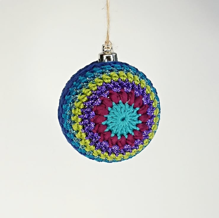 They have been crocheted using cotton yarn with glitter yarn around a plastic bauble, with a twine hanging loop.