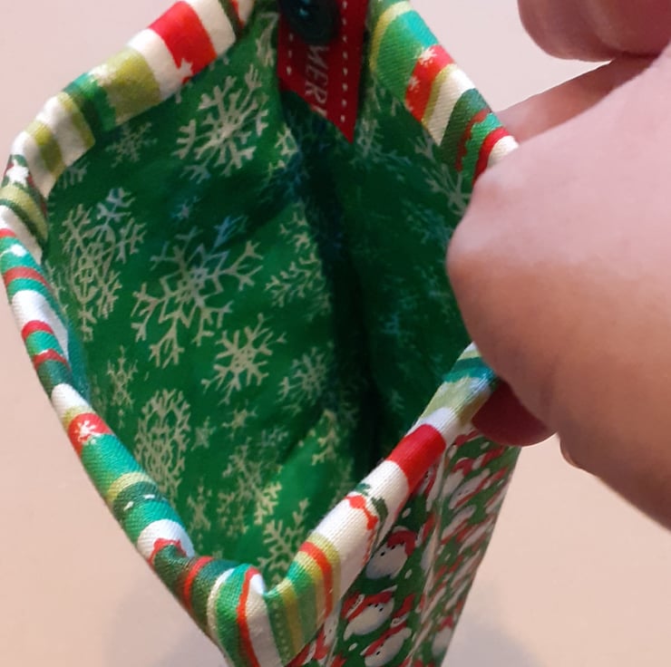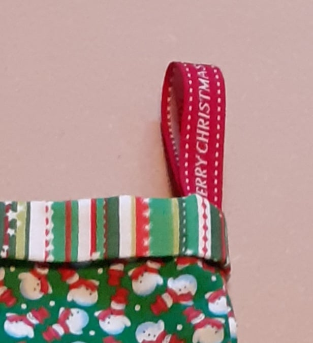 The stocking is hung by red ribbon, with “Merry Christmas” in white letters and is attached to the inside with a green button.
