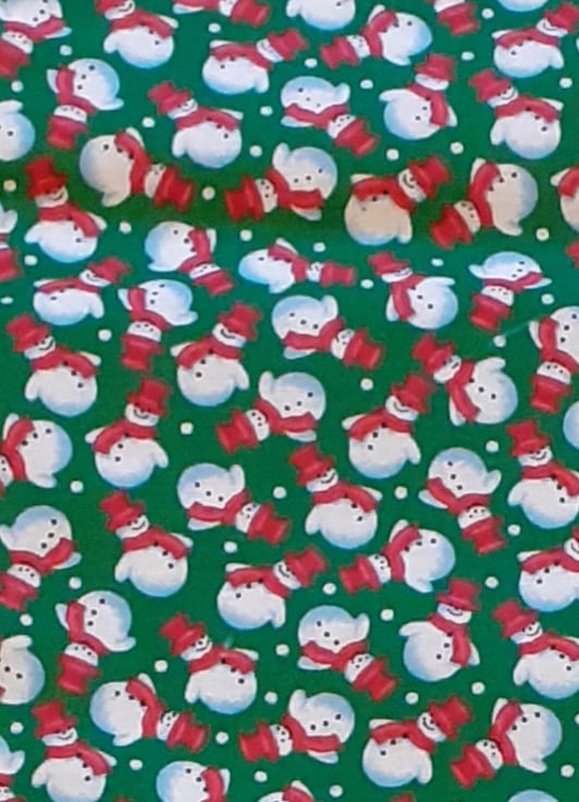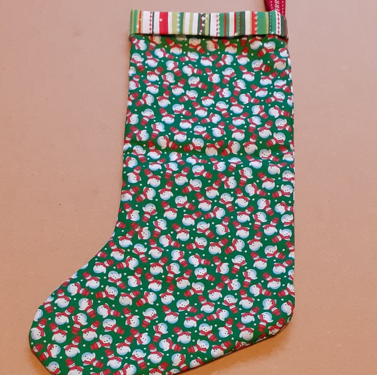 This cute cotton fabric stocking, features happy snowmen on the outside, snowflakes on the lining and is trimmed with a multi coloured striped fabric.