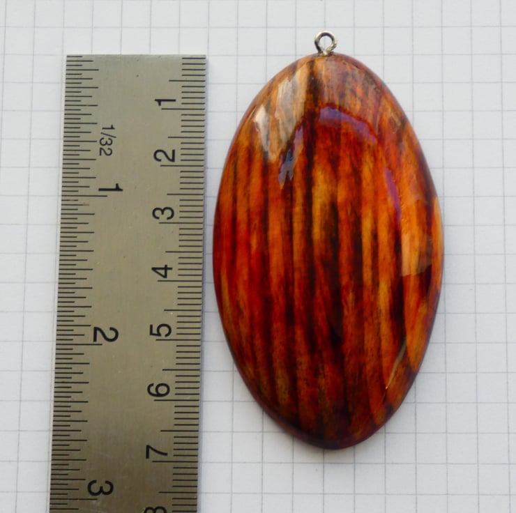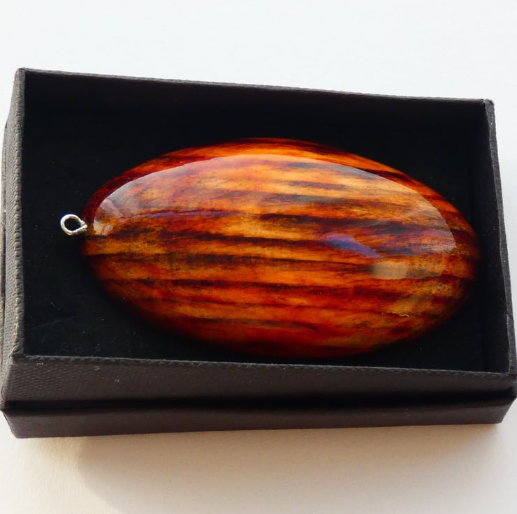 This pendant was cut and shaped from a piece of wood before being sanded to a smooth finish. The wood stain was added one colour at a time and was lightly sanded between each colour to enable me to leave enough of any particular colour to achieve the desired result. It is smooth to the touch and has been finished with several coats of Lacquer to enhance the grain whilst also protecting the pendant.
