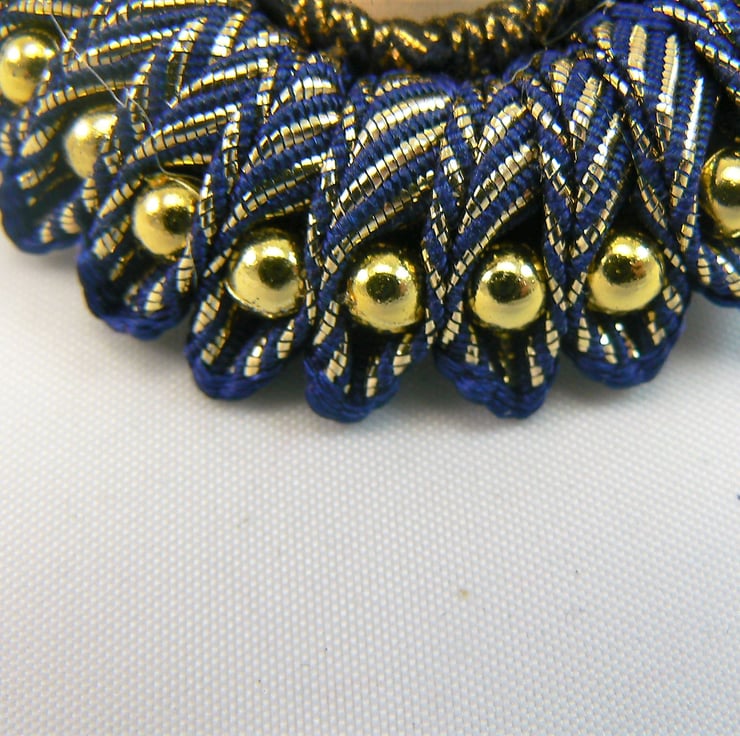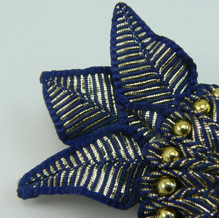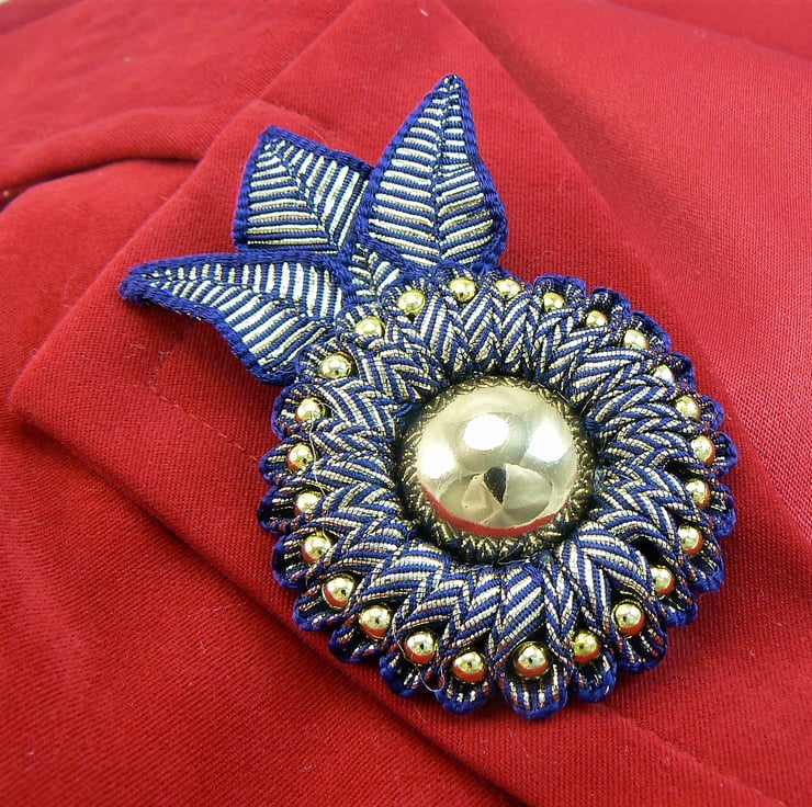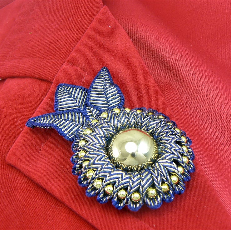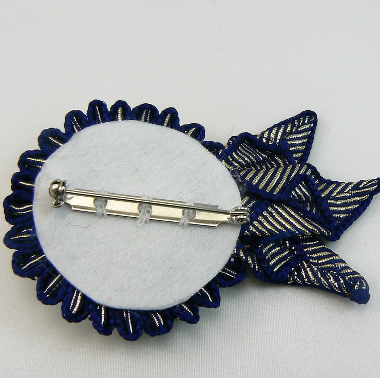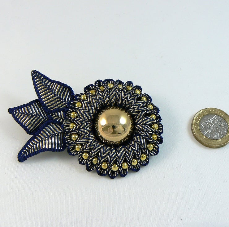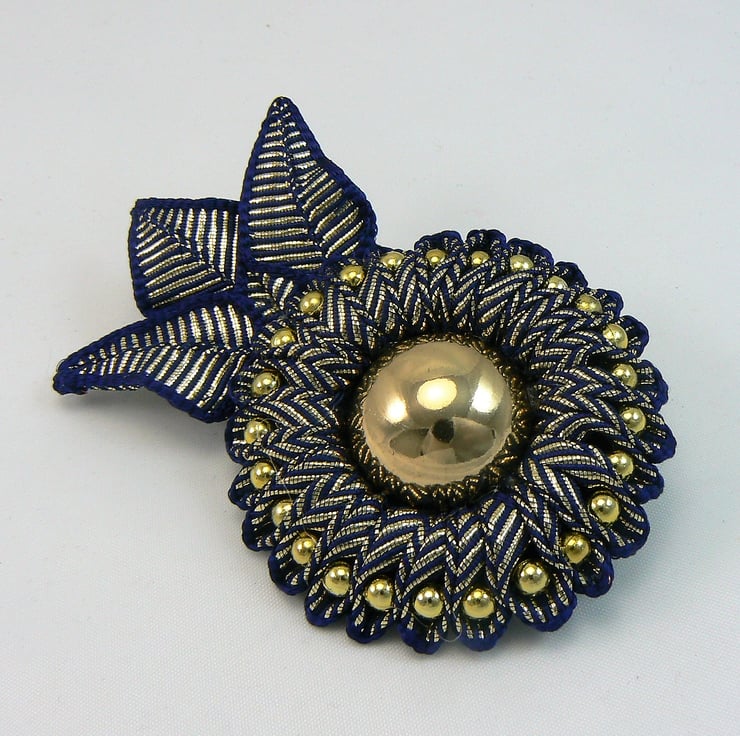 This brooch I made from grosgrain ribbon, I have folded and sewn the petals together and then sewn beads in between the folds. I then made some leaves and added them to the flower. In the last photo you can see the ribbon that I started out from . In the centre I mounted a gold dome shiny button and finally sown a brooch clasp on the back. It measures 2" in diameter across the flower part and is three and a quarter inches in length when including the leaves.