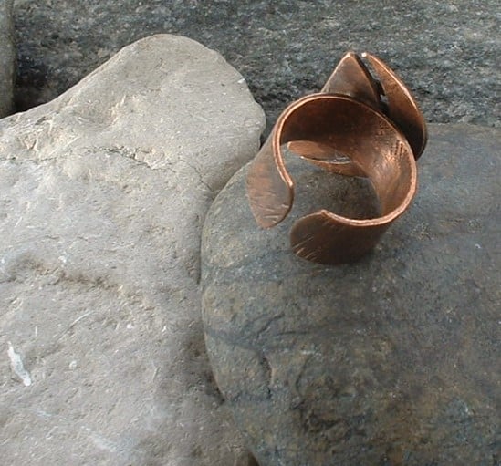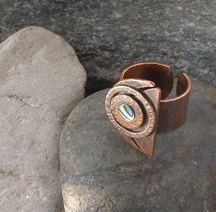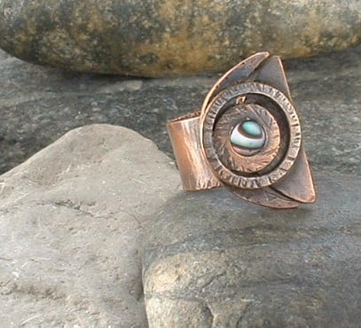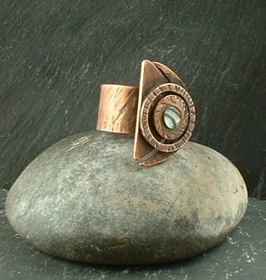 Created using copper plate cut and filed to shape and textured copper washers soldered in place with a small circle of mother of pearl to add a shimmer. It has been soldered onto a wide textured copper band and given a rich antique patina which has been sealed with a silicon wax polish.