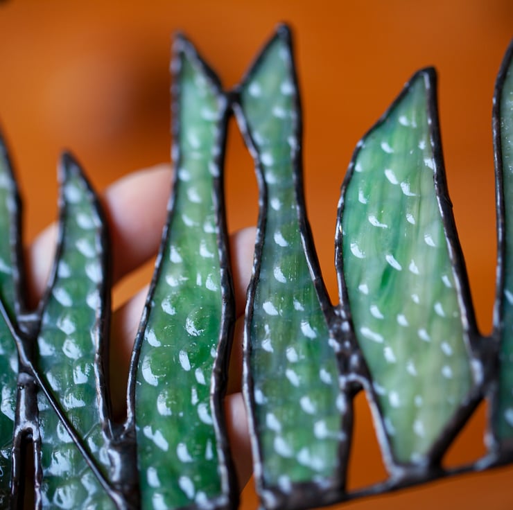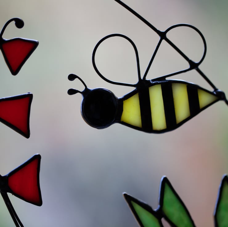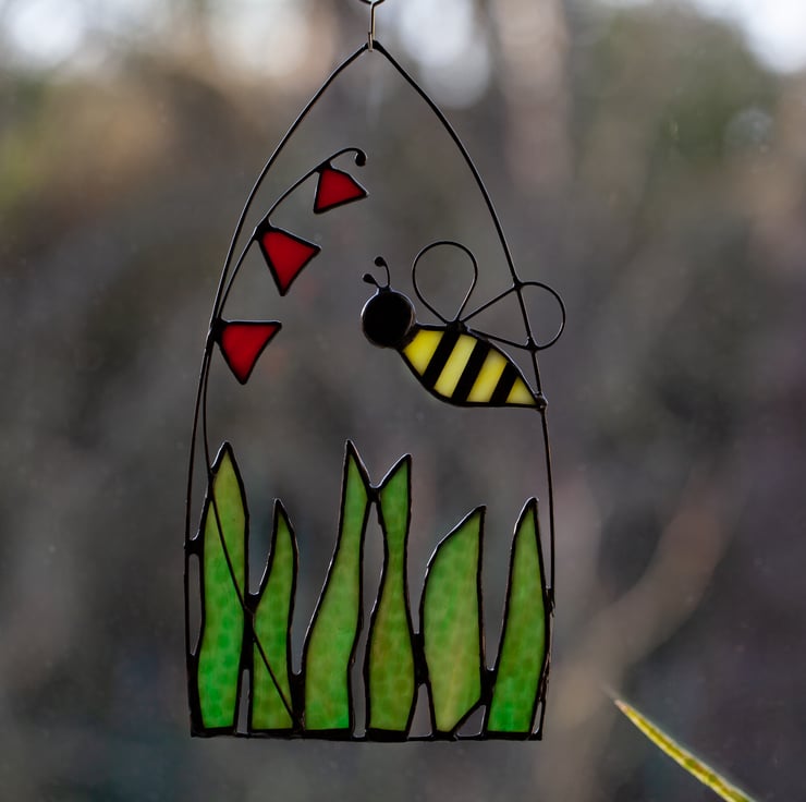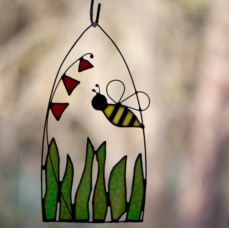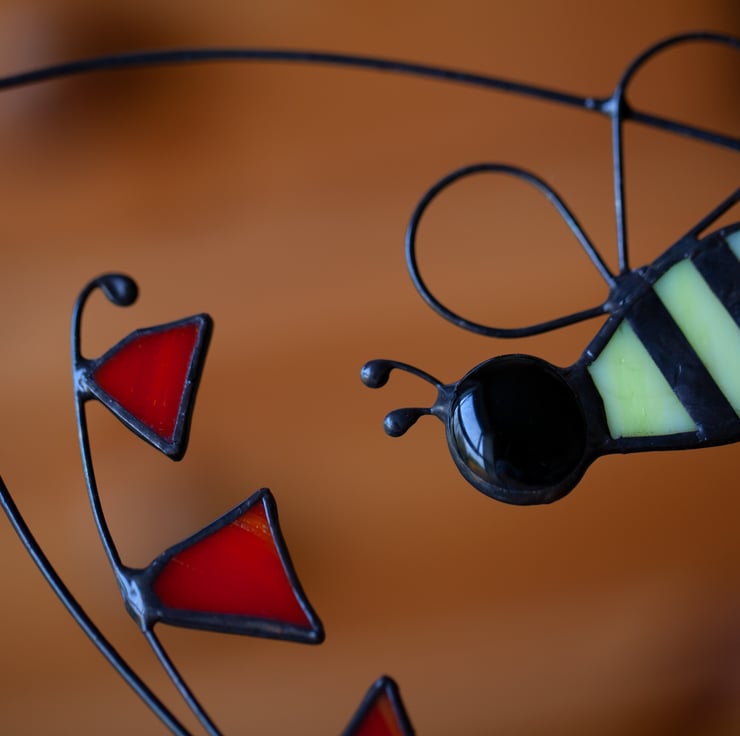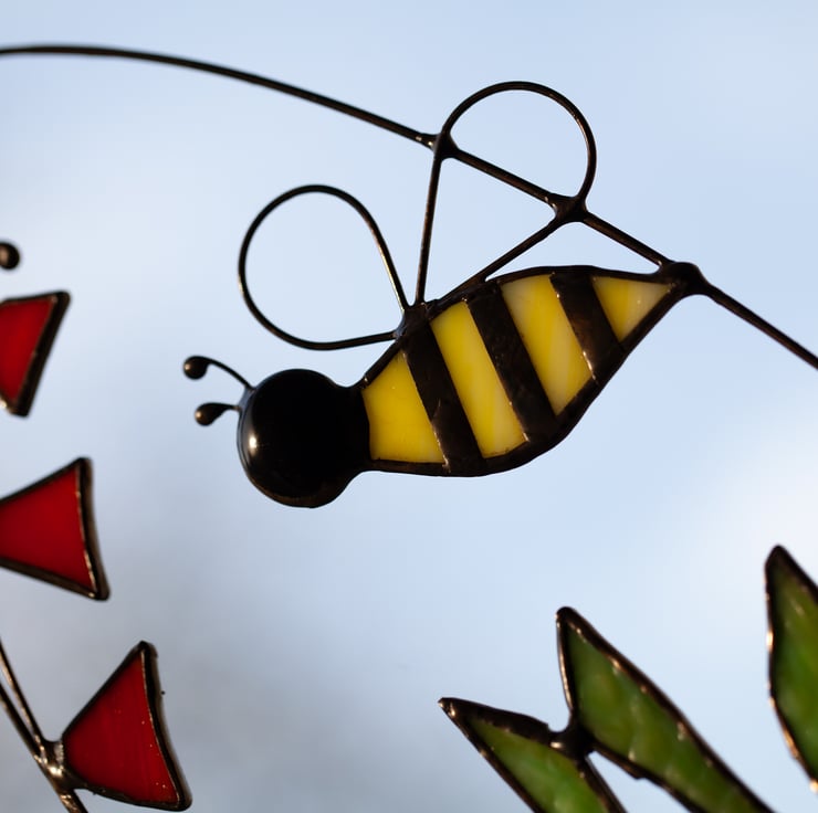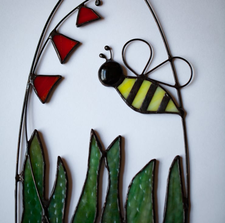 Lovely stained glass sun catcher. Made with traditional Tiffany technique. To create this I’ve used stained glass, glass nugget, lead solder, tinned copper wire and copper foil.