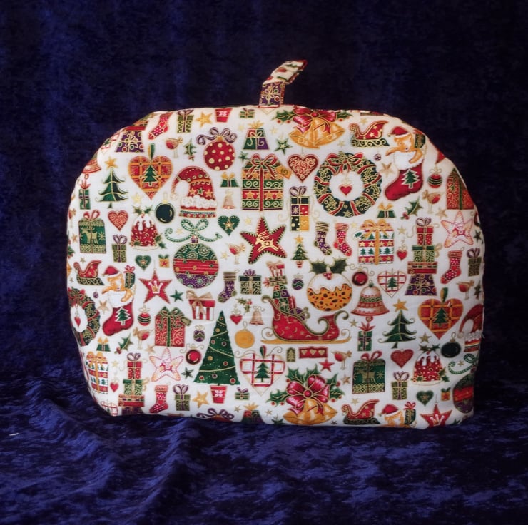This Christmas Tea cosy features has a design of Christmas Trees, Wreaths, Bells and other Christmas Decorations on a cream background. It is made from 100% Cotton with polyester wadding which is stitched to the lining to prevent it from bunching up when it is washed. It even has a handy hanging loop so you could even use it as part of your decorations in the kitchen.