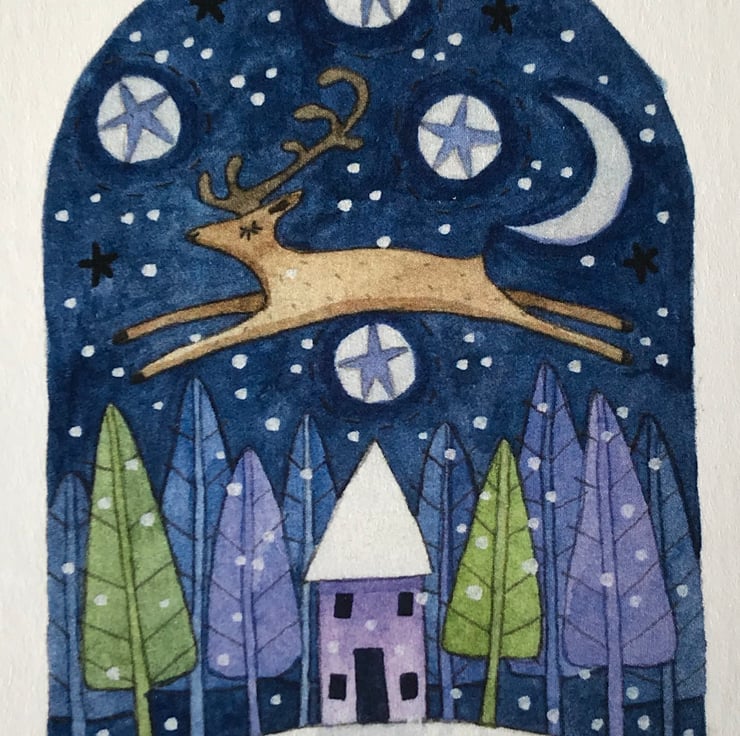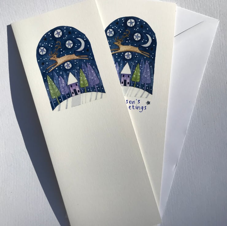 An 80 x 210mm card, printed from an original design by Three Acorns on 300gsm board and supplied with envelope. This card is suitable for Christmas, Winter/General birthday and is blank inside. Please note that this card is also blank on front. There is another listing of a set of four with hand lettering and star sequin embellishments.