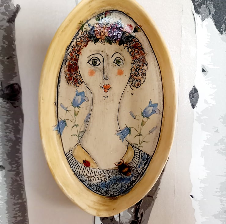 Pressed in white clay ,drawn with coloured slips and glazed in a transparent glaze .This small dish /wall piece measures 15 cm in height. Ceramic decals of flowers birds and insects are added to give detail. Each one of these pieces are individually drawn and decorated . Will be carefully packed and posted.