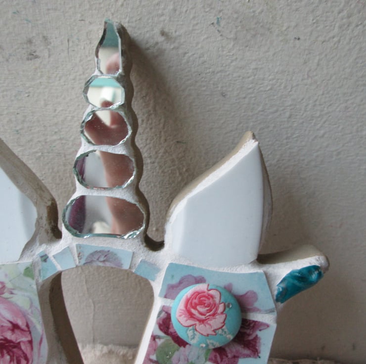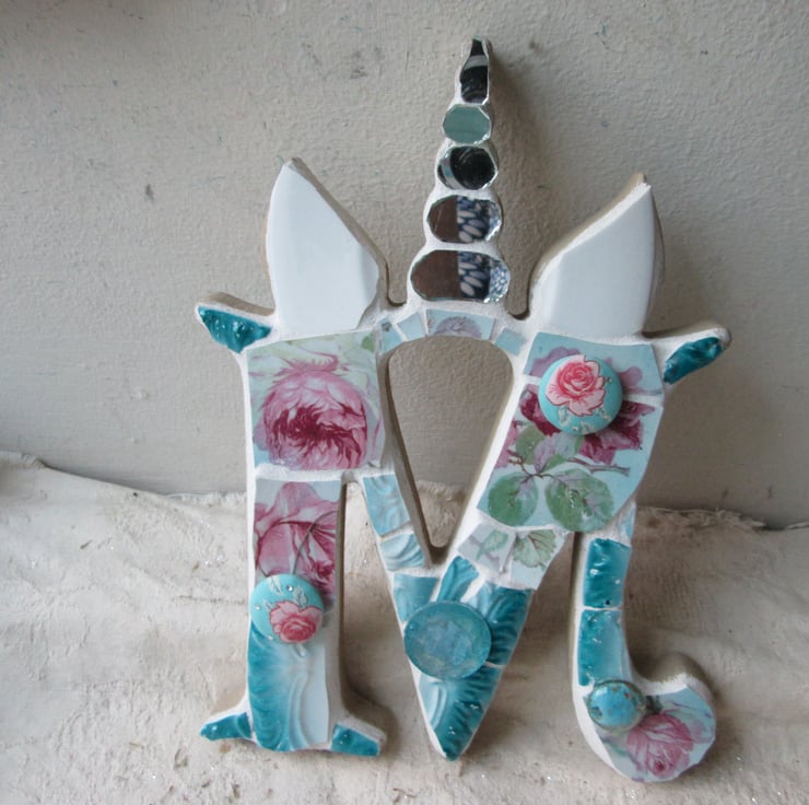 This letter M is made from vintage pottery and mirror tiles it has a unicorns horn and ears. it is 26cm x 19cm in size and comes with a hanging attachment on the back.