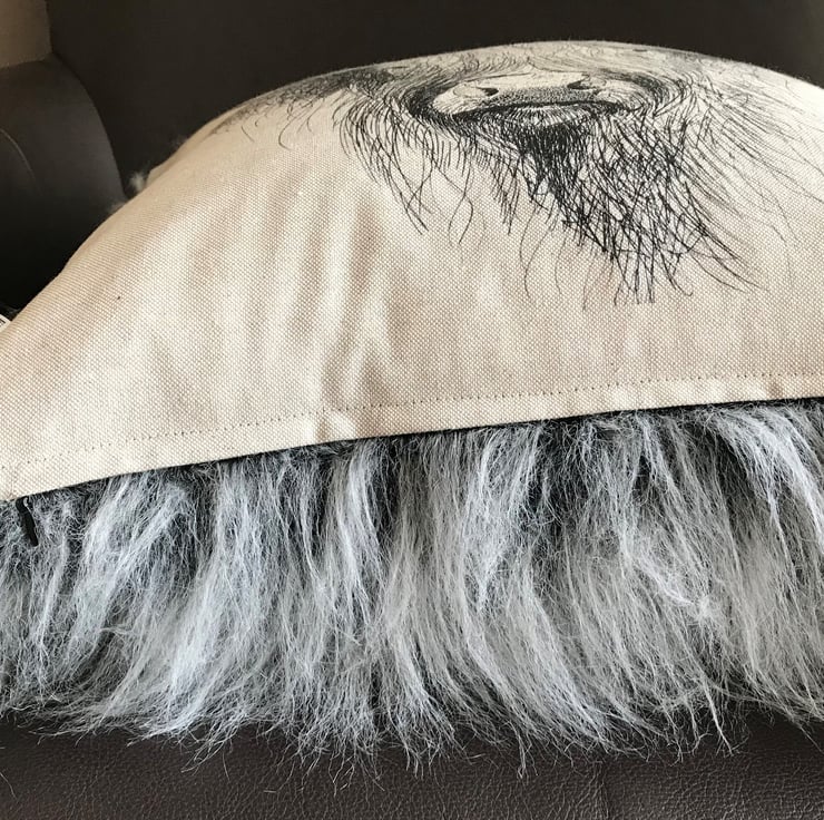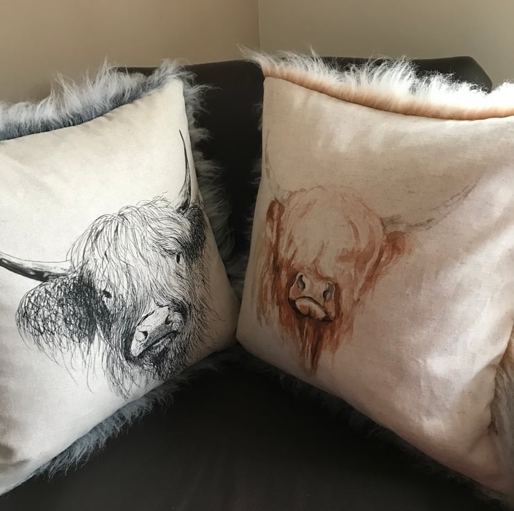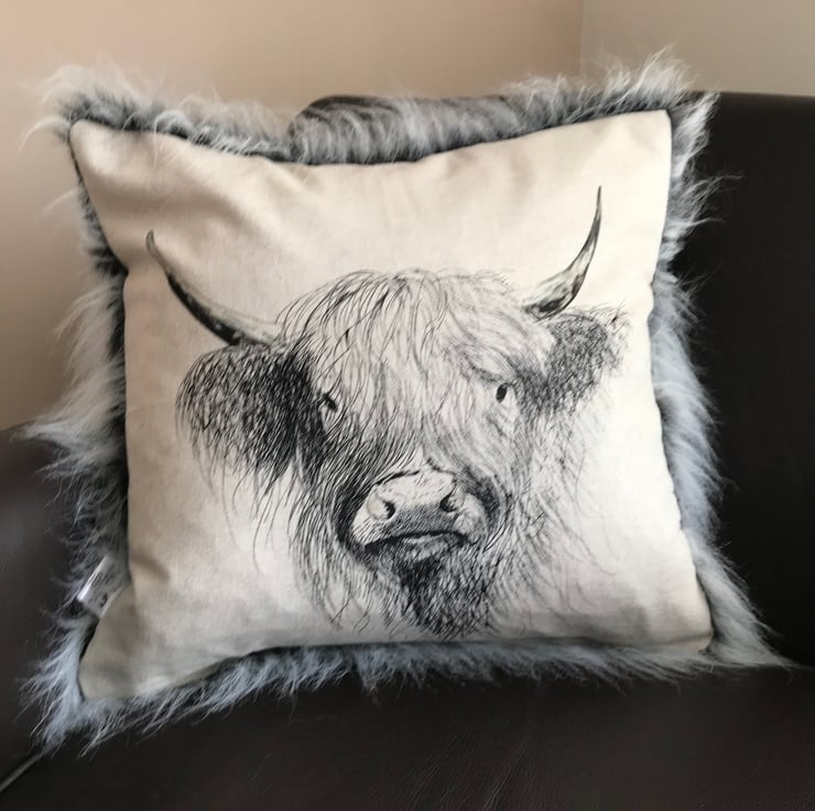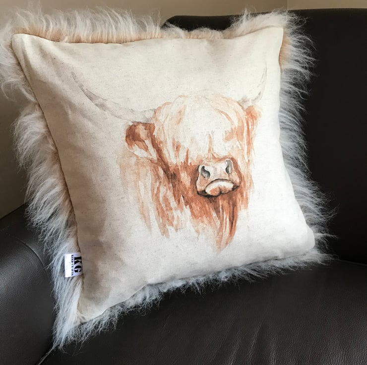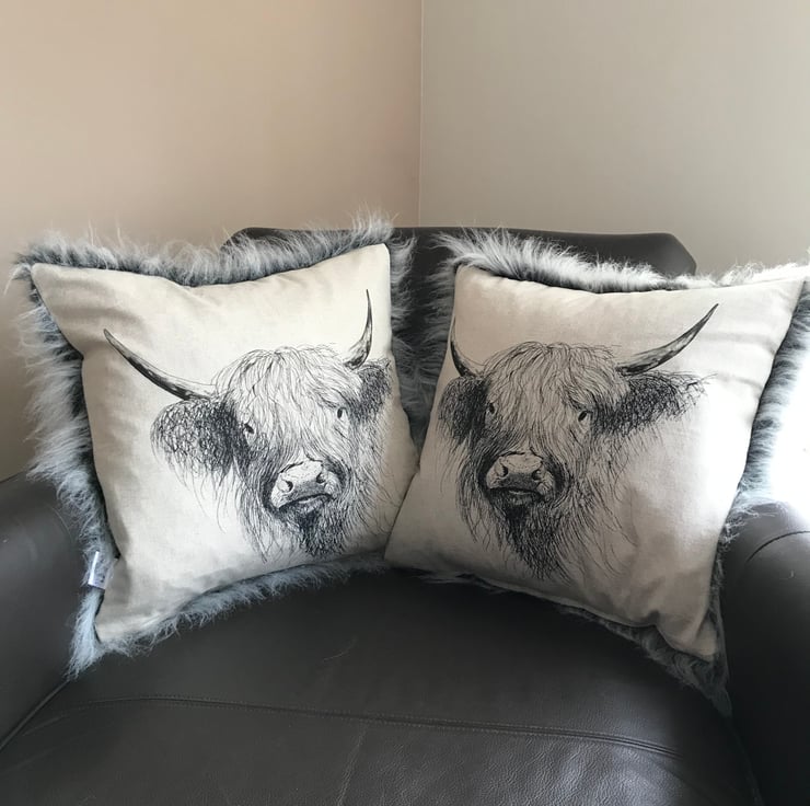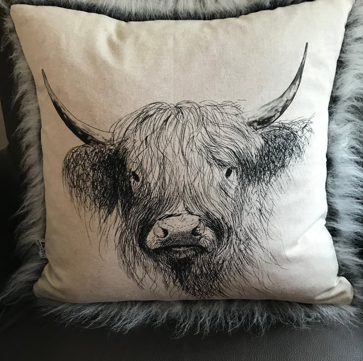 The cushion is made from linen type fabric on the front with a print of a High Land Cow in black pencil or ginger colour print, on one side.
