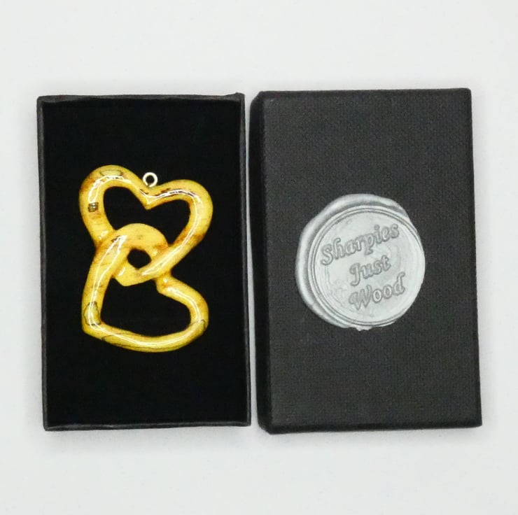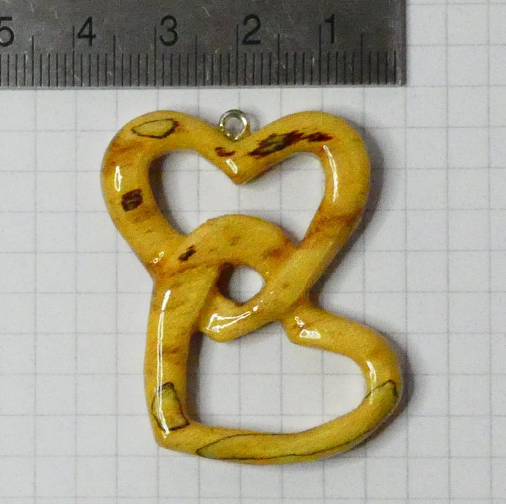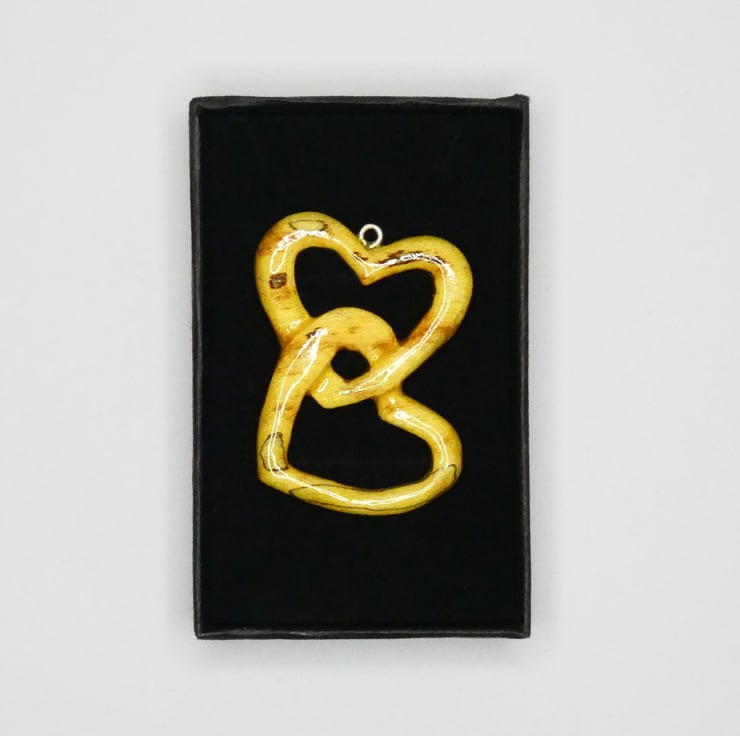 This two heart pendant was cut and shaped from a piece of wood before being sanded to a smooth finish. It is smooth to the touch and has been finished with several coats of Lacquer to enhance the grain whilst also protecting the pendant.