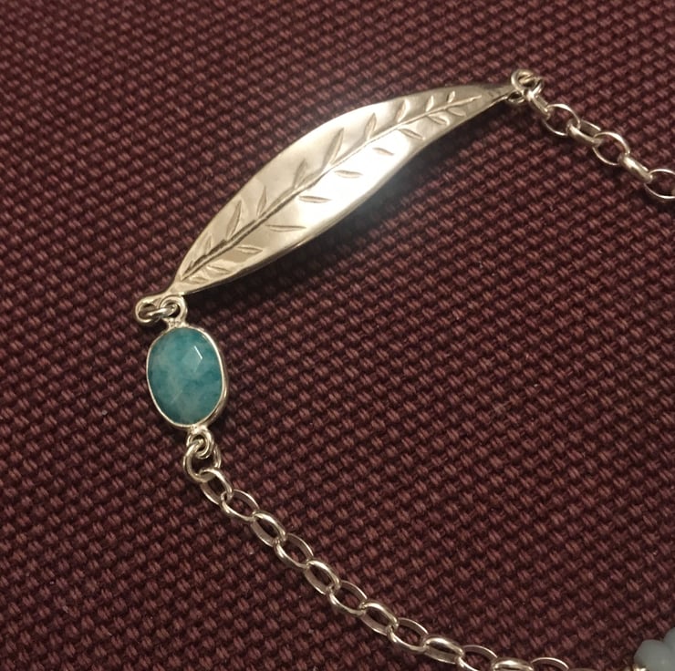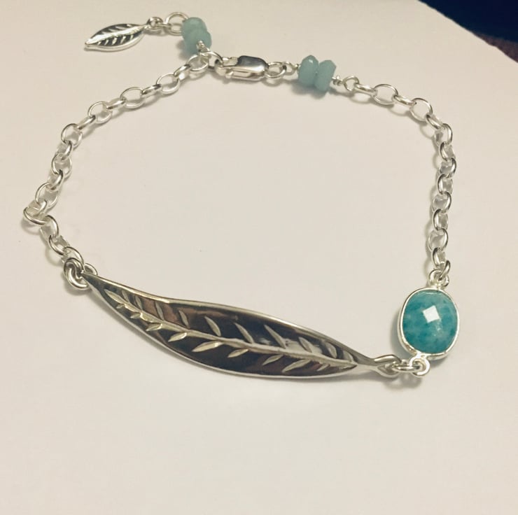 Alongside the leaf there is an open-set faceted amazonite stone, measuring 8mm.