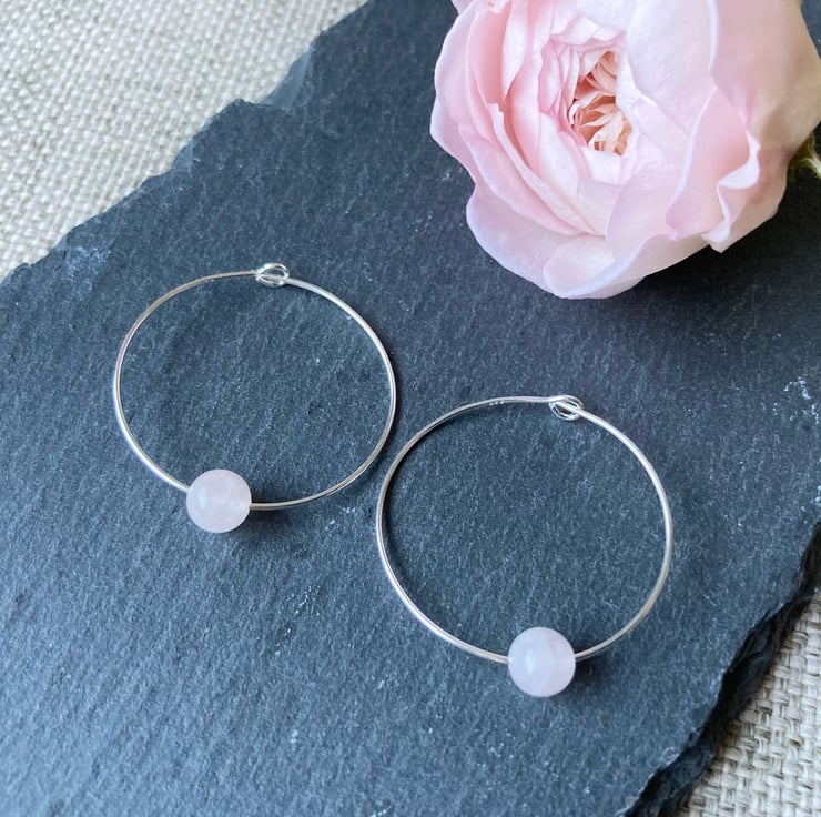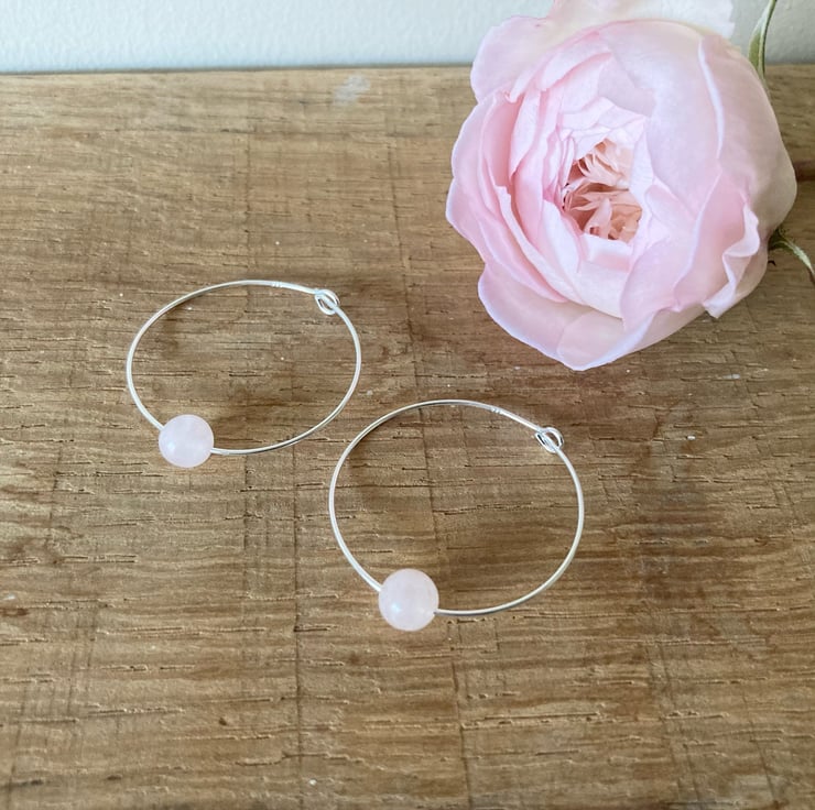 Beautifully simple earrings made with pale pink rose quartz beads on sterling silver earring hoops. The beads are 6mm in diameter and the hoops are approximately 3cm in diameter. Gorgeous earrings in a beautiful subtle colour.