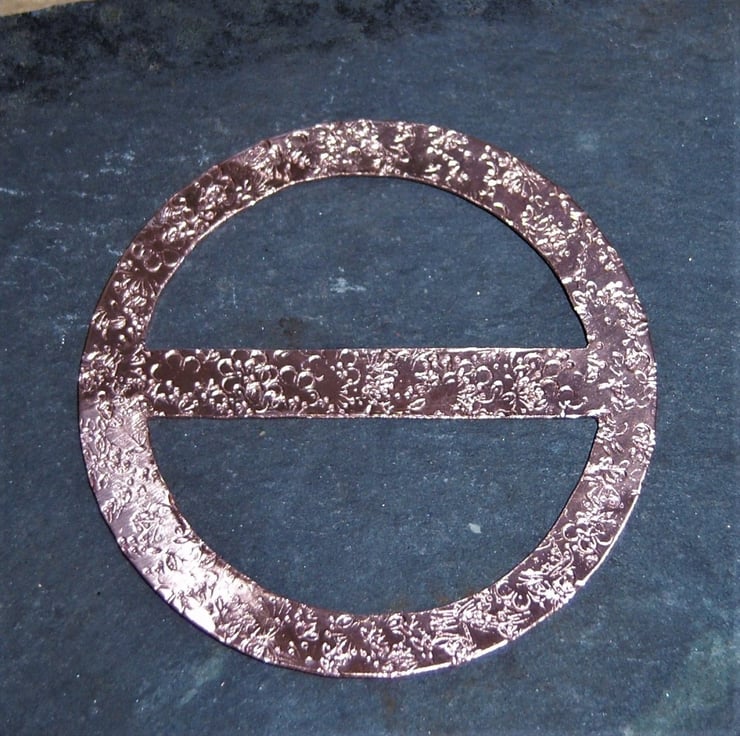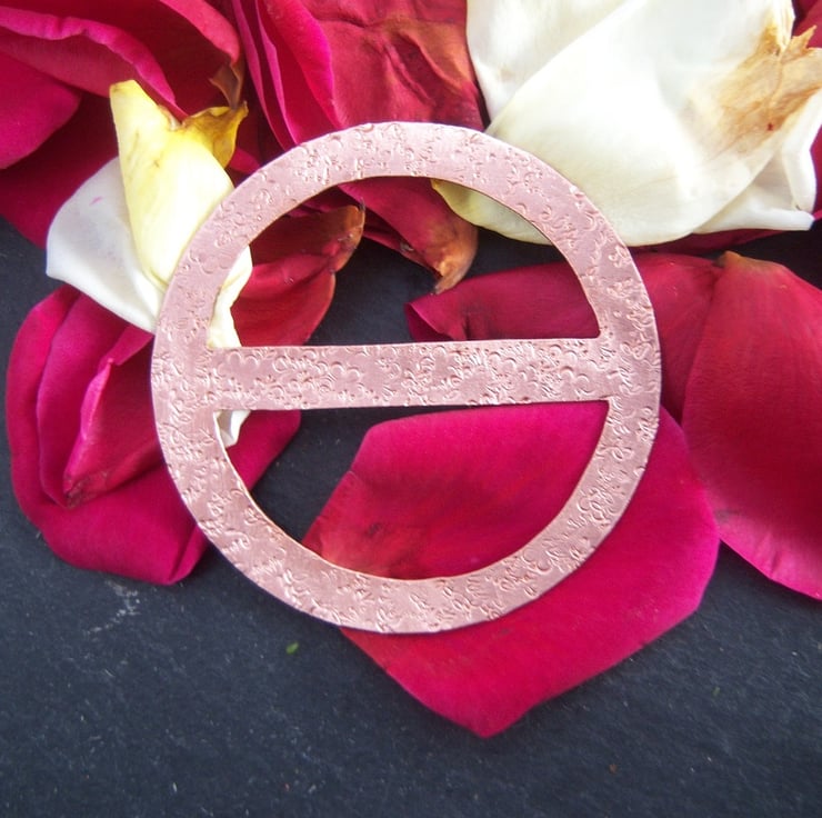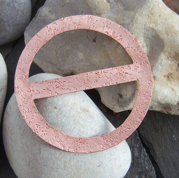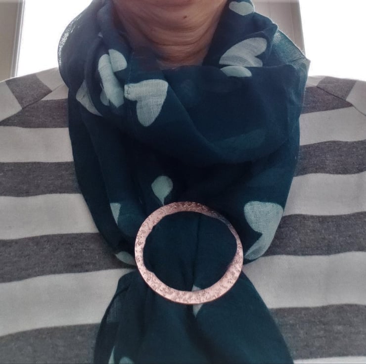A scarf ring cut from copper sheet and textured with random flower imprints. Measures just over 6cms across. Ideal for a thin cotton or silk scarf. (Scarf in the photo is not included).
